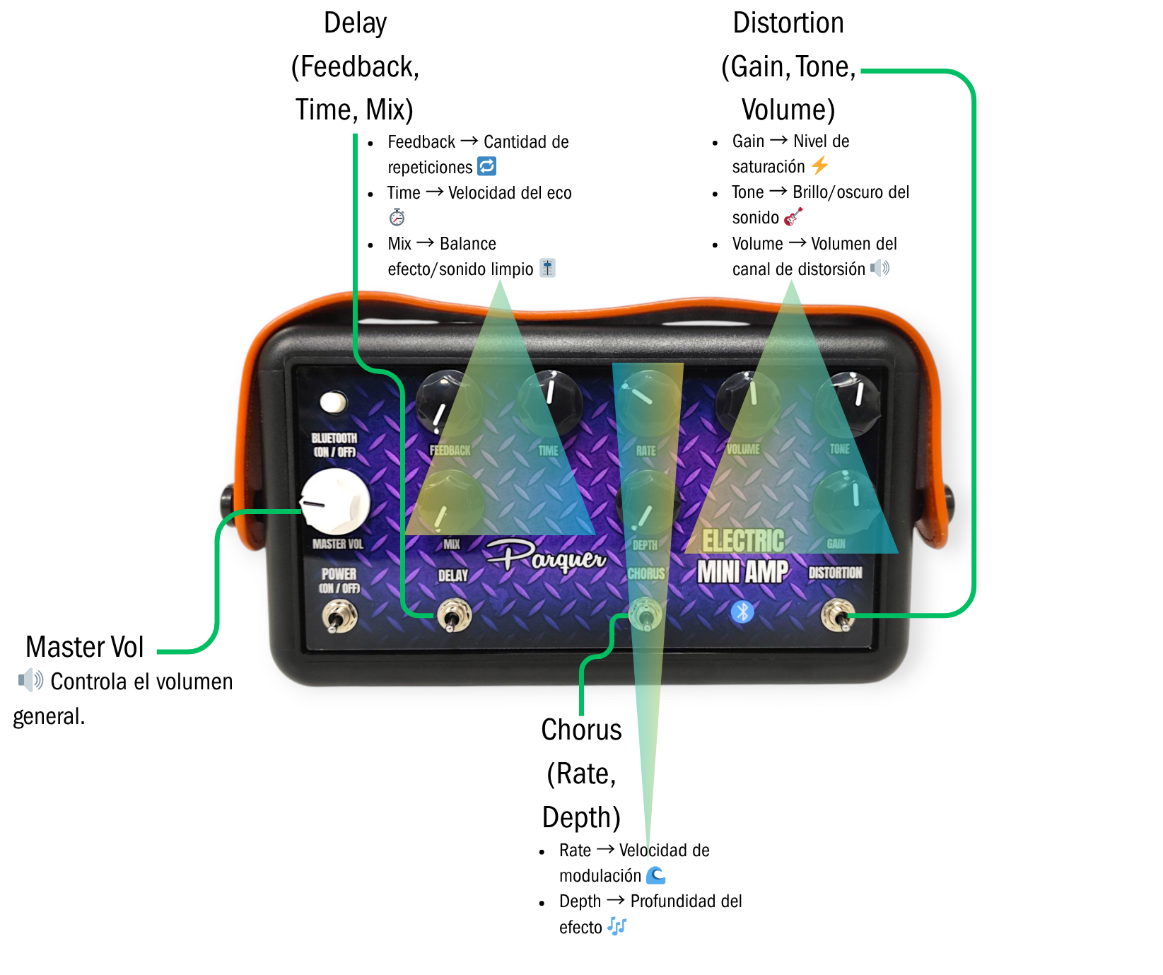 Tres efectos integrados: Delay, Chorus y Distorsión.