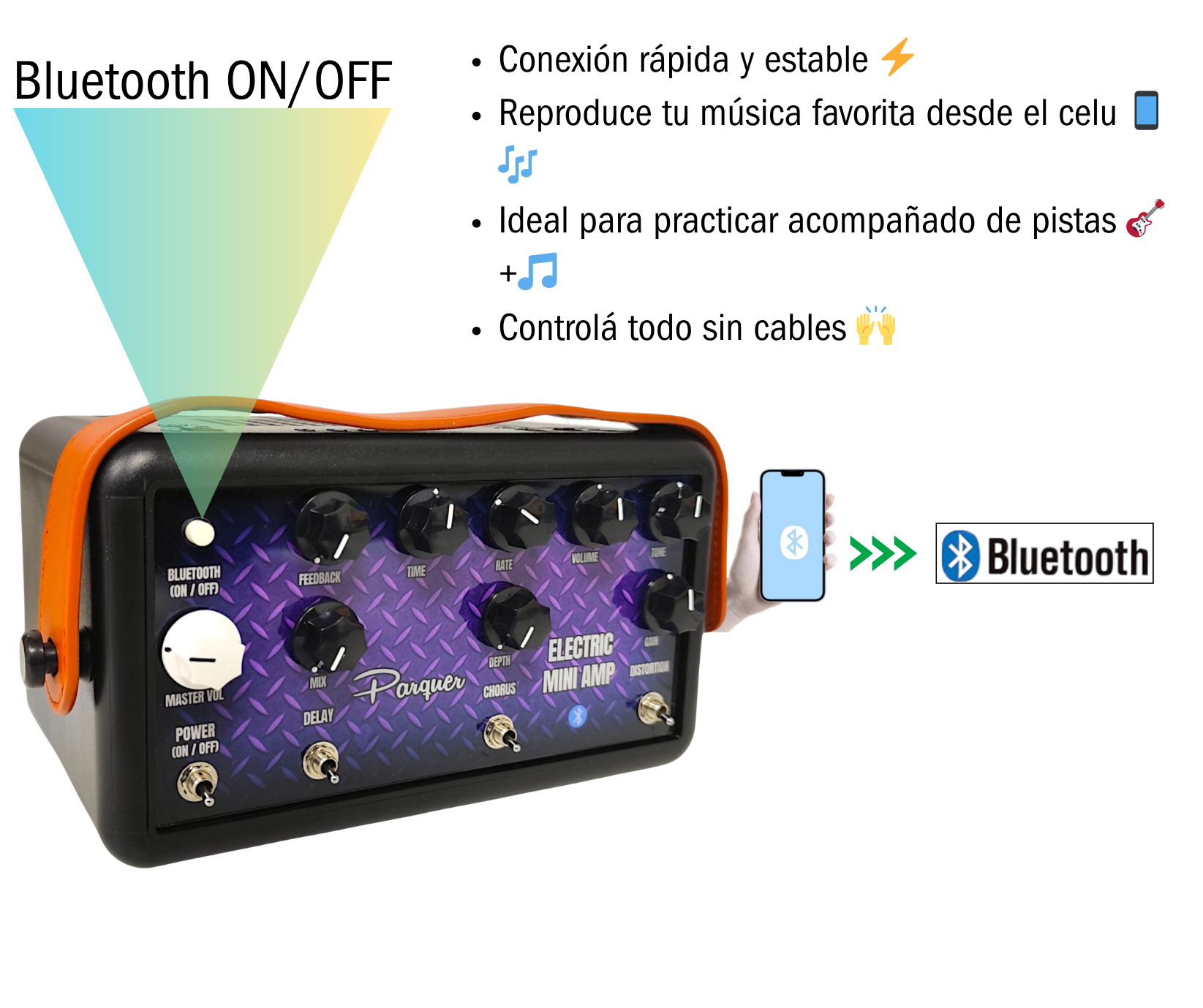Cuenta con conectividad Bluetooth para reproducir música directamente desde tu celular, permitiendo tocar encima de tus pistas favoritas. Además, incluye tres efectos integrados esenciales: Delay, Chorus y Distorsión, para que explores diferentes estilos y sonidos sin necesidad de pedales externos.