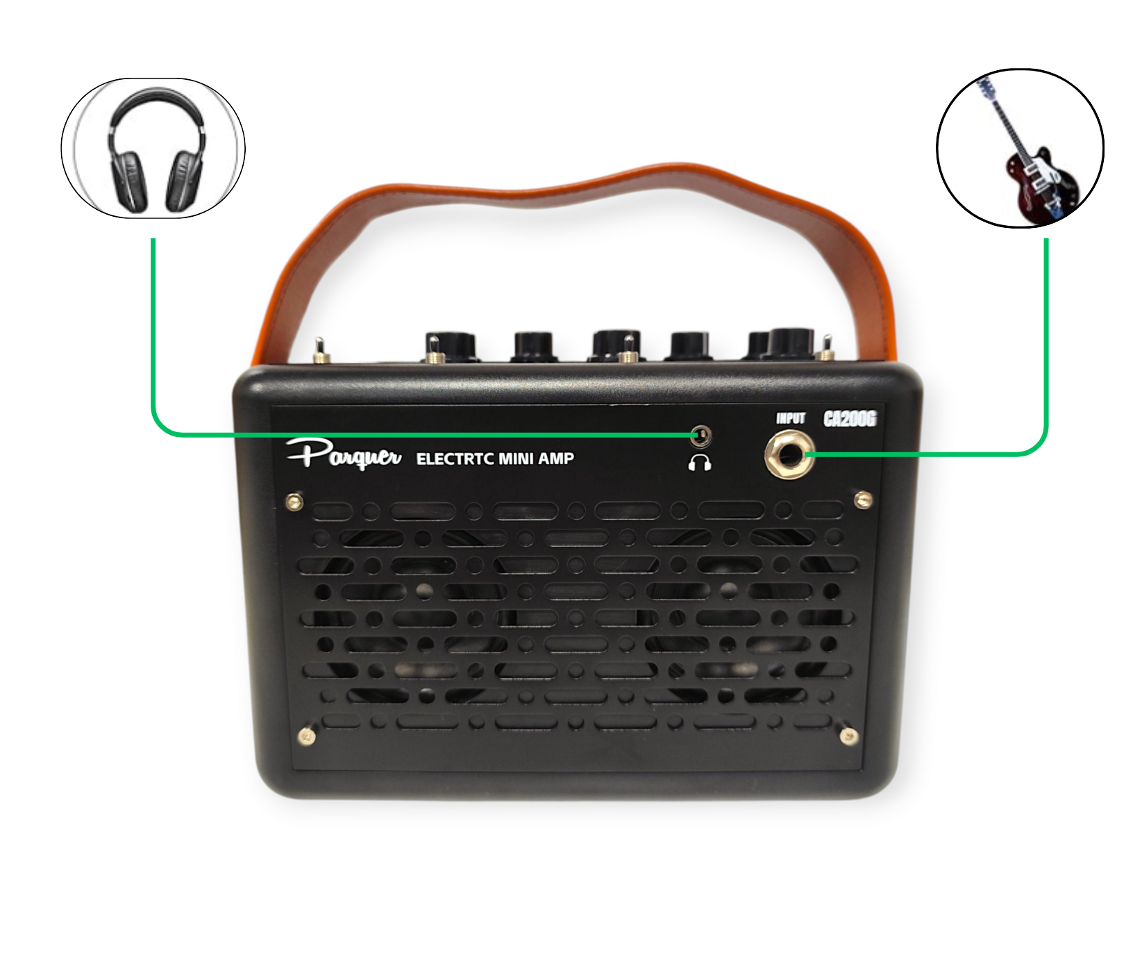 El Parquer CA200G también funciona como fuente de alimentación para pedales de efectos, gracias a sus 3 salidas de 9V DC. Incluye conexión para auriculares, ideal para practicar en silencio sin perder calidad de sonido.