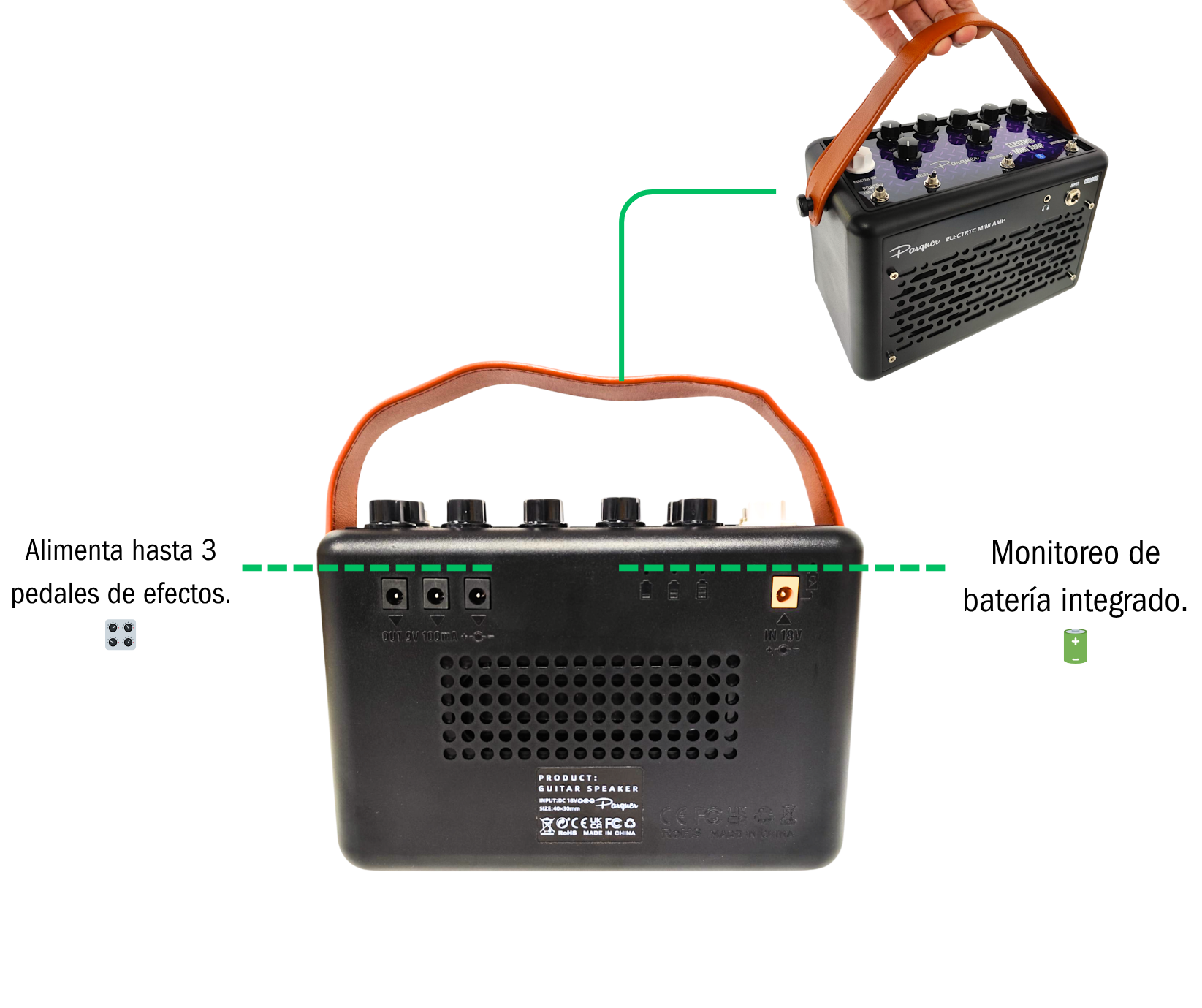3 salidas de 9V DC (100mA) para alimentar pedales de efectos.
