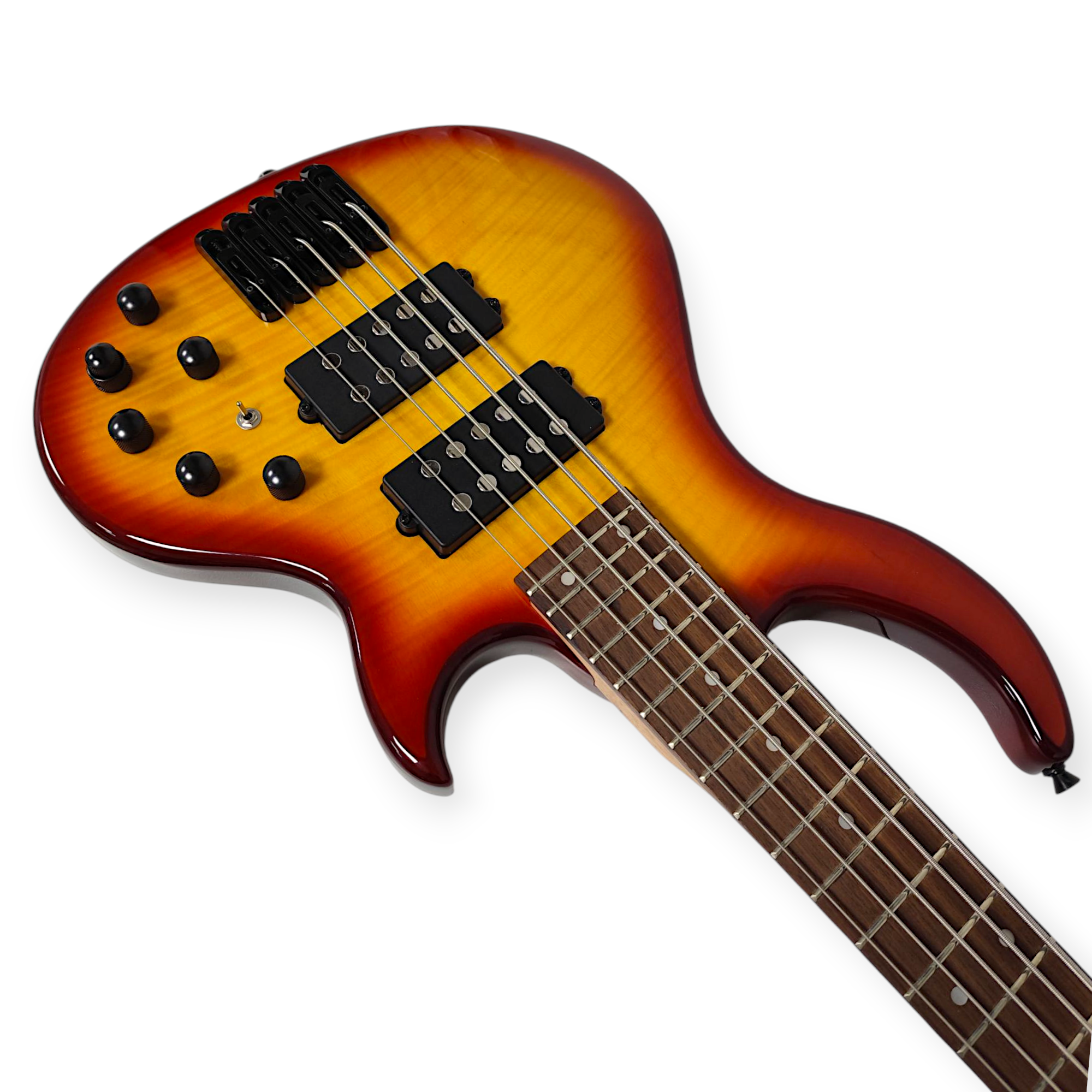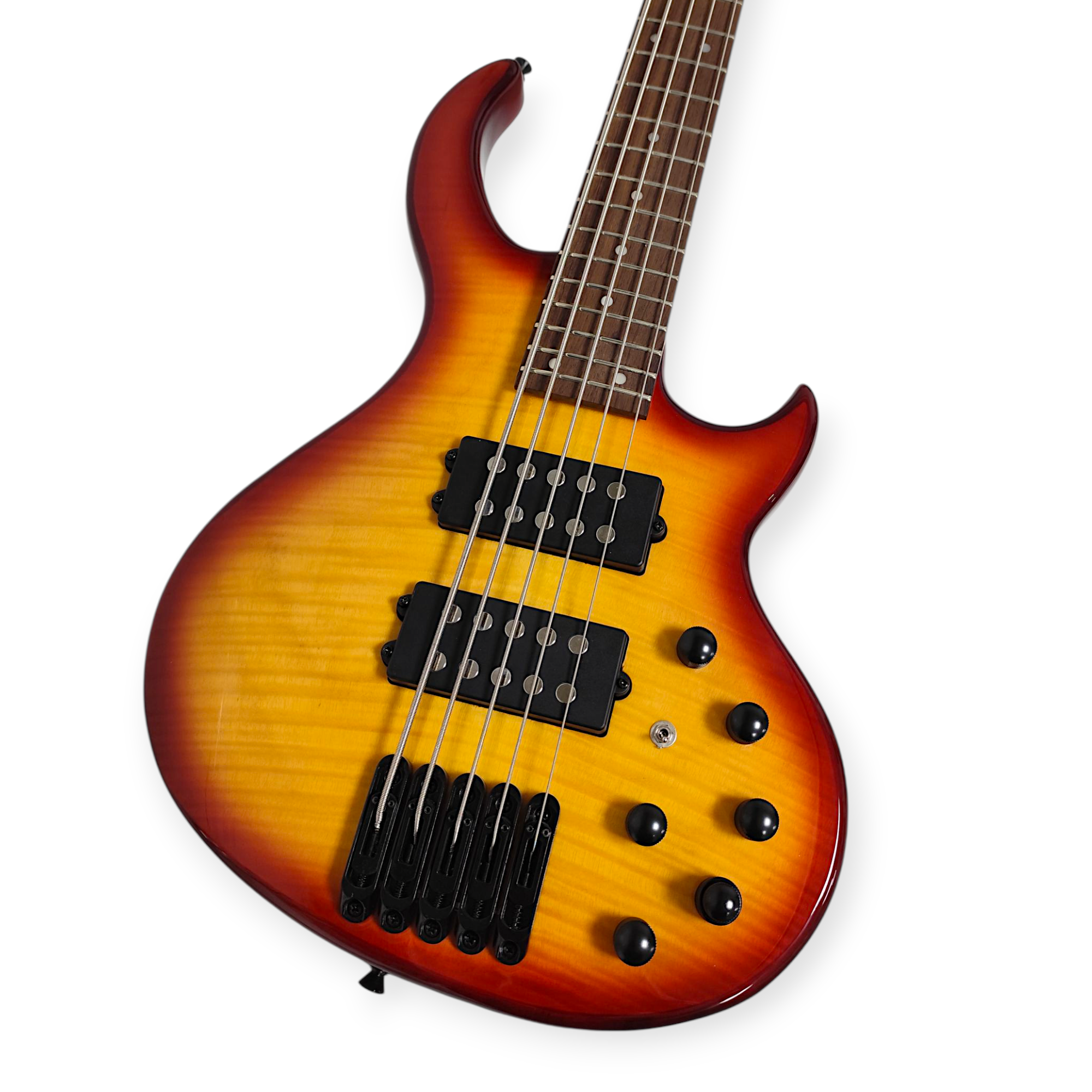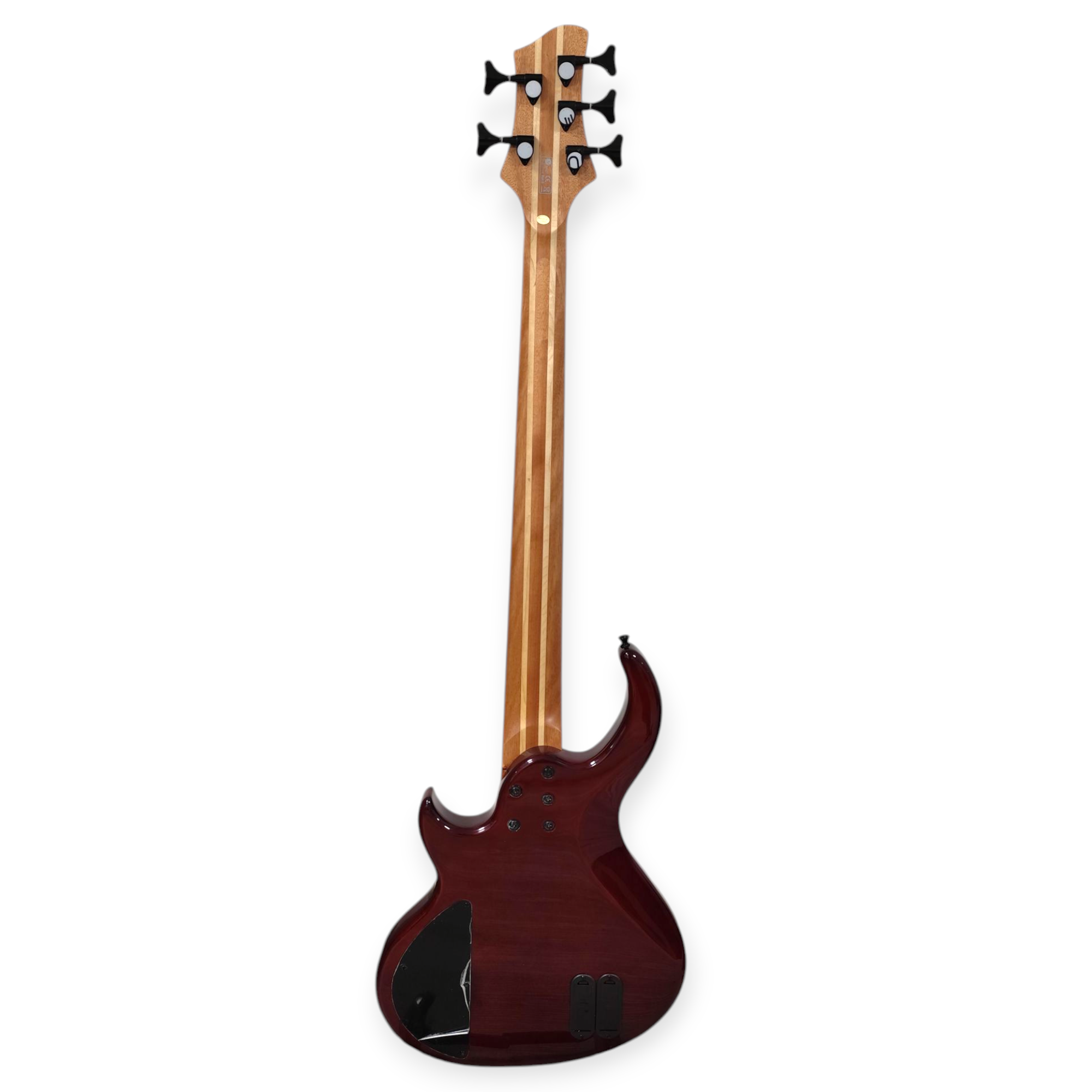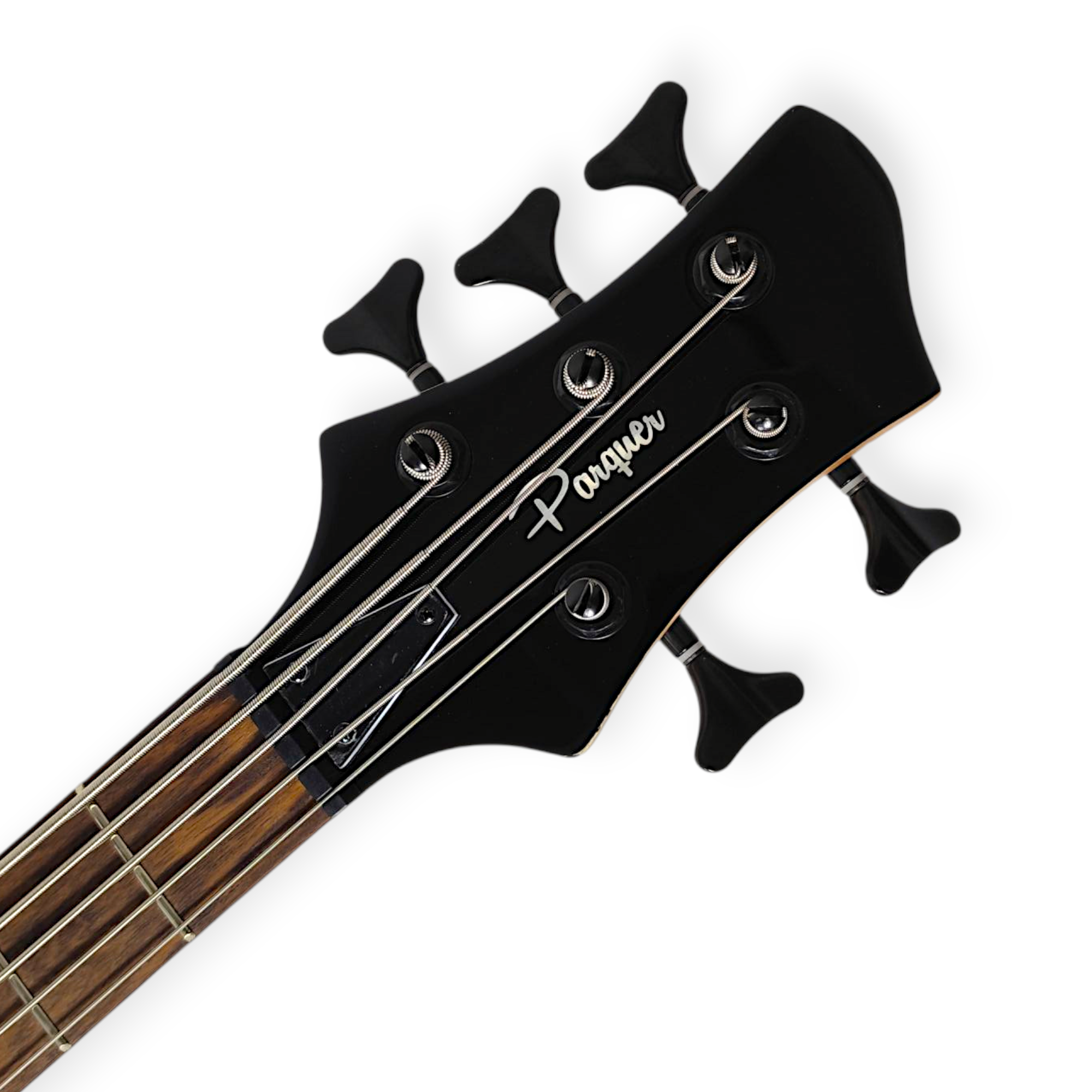 El bajo Parquer de 5 cuerdas es un instrumento versátil y moderno, ideal para bajistas que buscan potencia, comodidad y un look llamativo. Su cuerpo de poplar con tapa de maple flameado luce un espectacular acabado Cherry Sunburst, resaltando la veta natural de la madera. El mástil de maple con diapasón de lauan ofrece una ejecución cómoda en todo el rango de sus 24 trastes, cubriendo dos octavas completas.