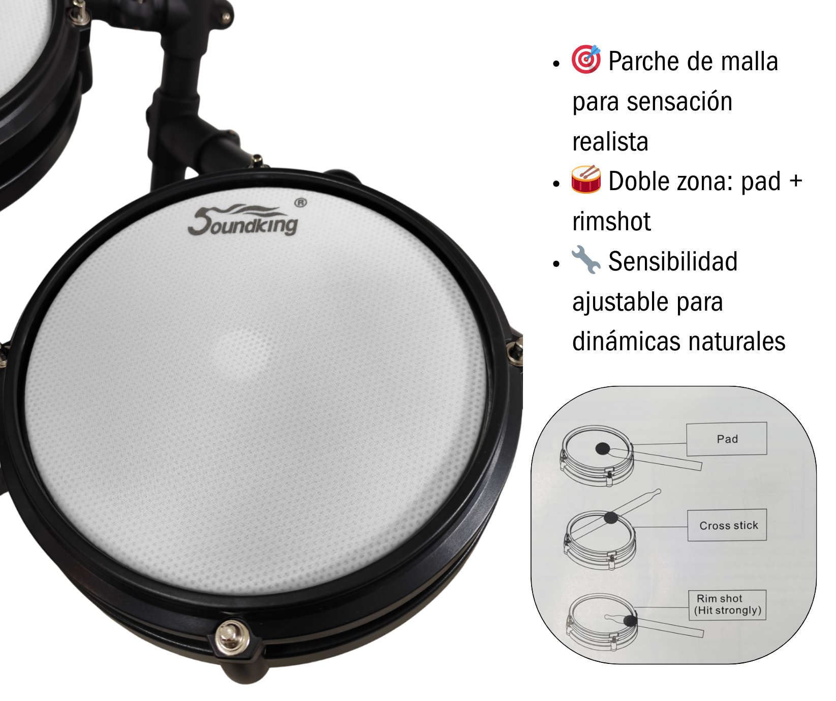 Pads con parches de malla: tacto natural, silencioso y con excelente rebote.