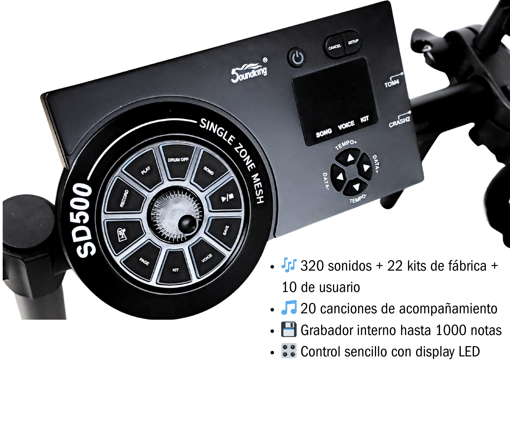 Con su módulo de sonido avanzado, la SD500 incorpora 320 voces de percusión, 128 tonos GM, 22 kits de batería preestablecidos y 10 kits de usuario personalizables, dándote la posibilidad de tocar cualquier estilo musical. Además, incluye funciones de grabación, metrónomo ajustable y 20 canciones de acompañamiento para mejorar tu práctica diaria.