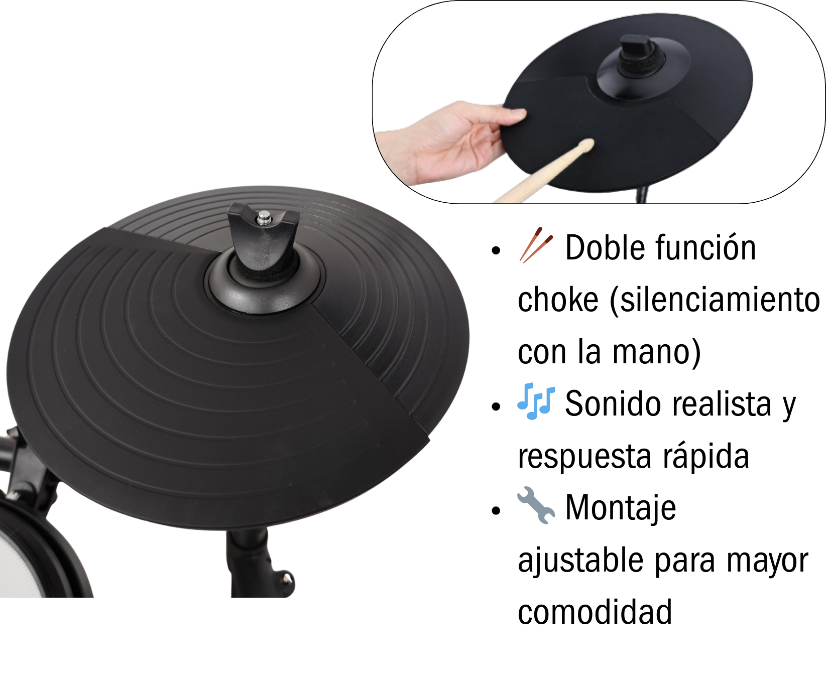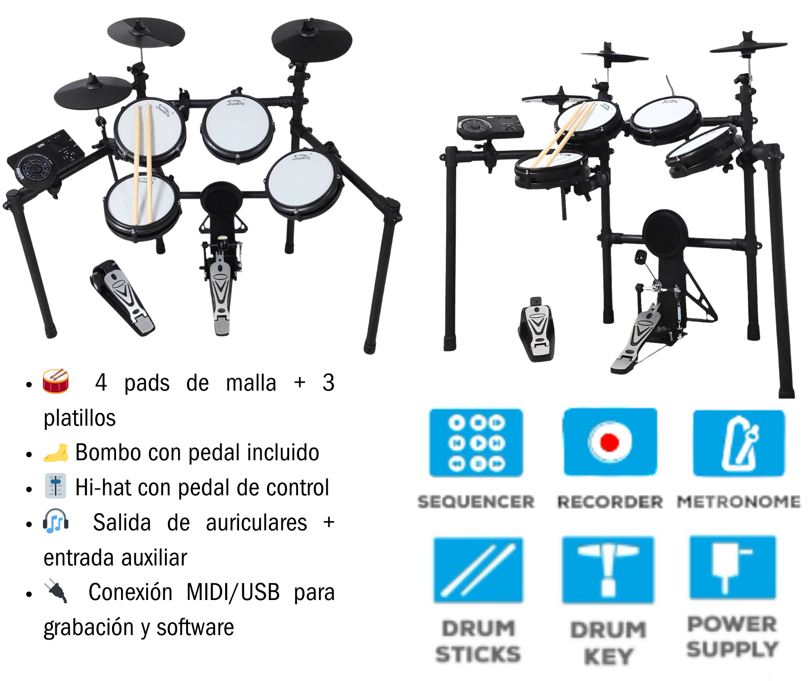 Pedales incluidos: bombo y hi-hat con respuesta precisa.