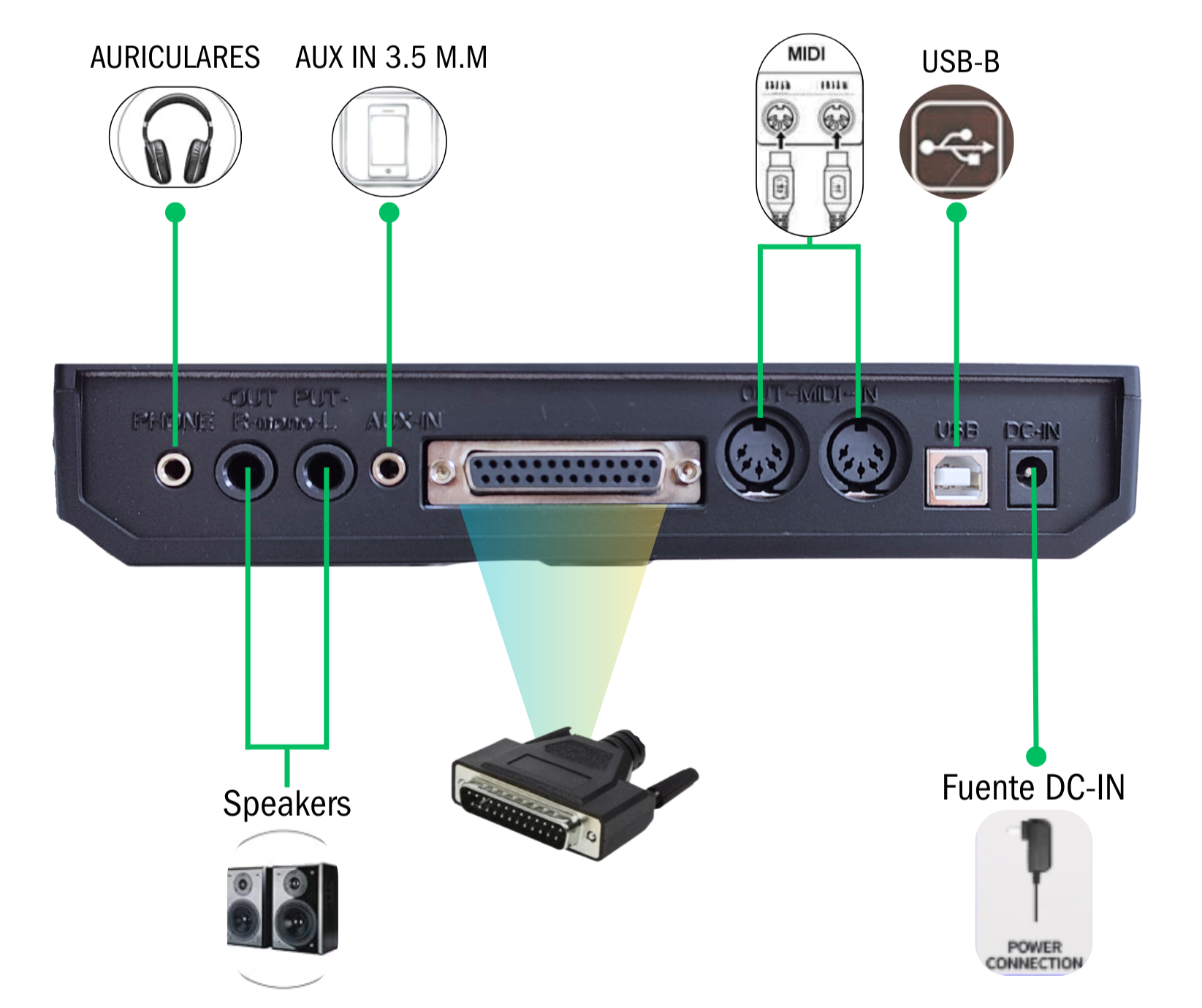 Conexiones: salida de auriculares (1/8”), entrada auxiliar (1/8”), salidas L/Mono y R (1/4”), MIDI IN/OUT, puerto USB tipo B, sensor D-SUB 25P
