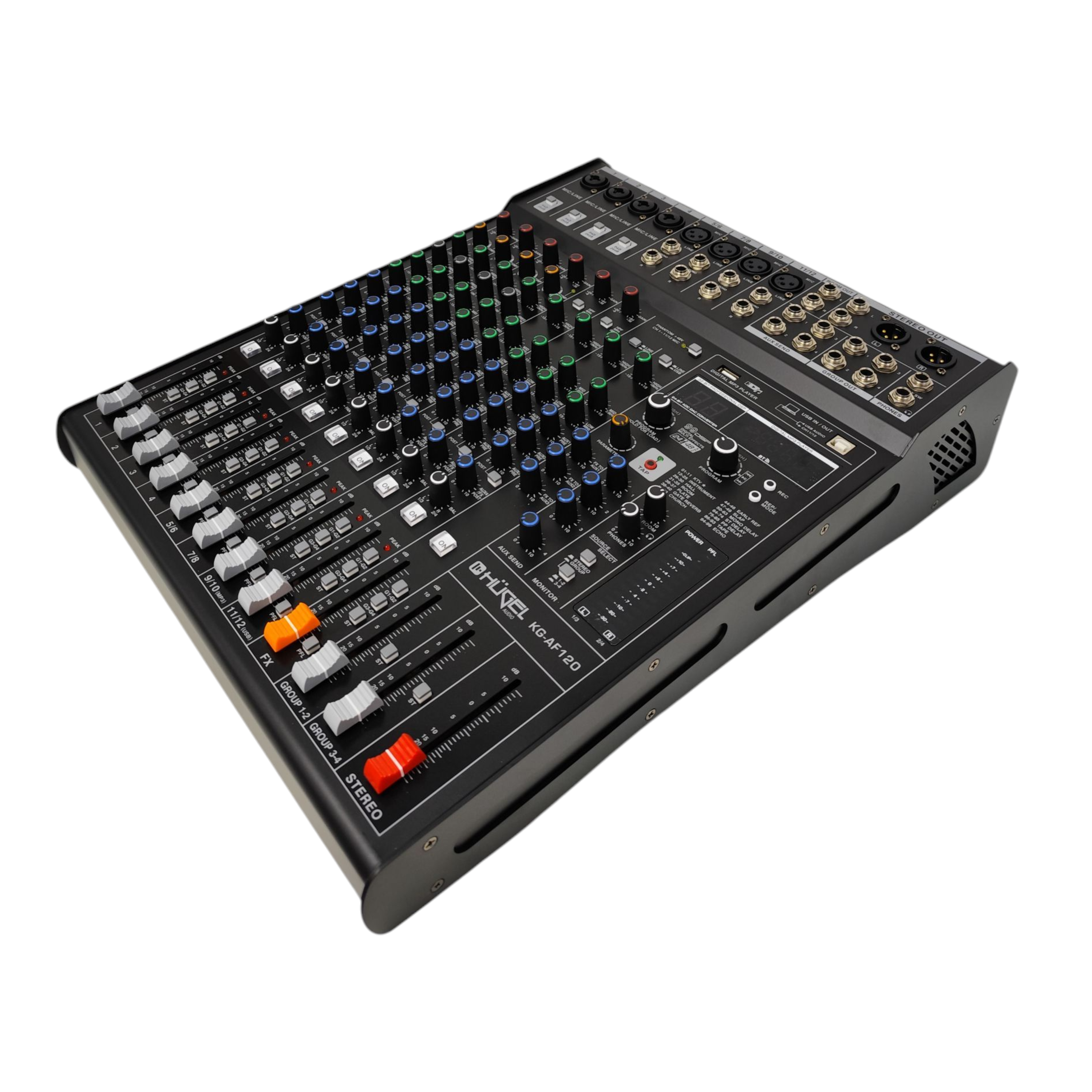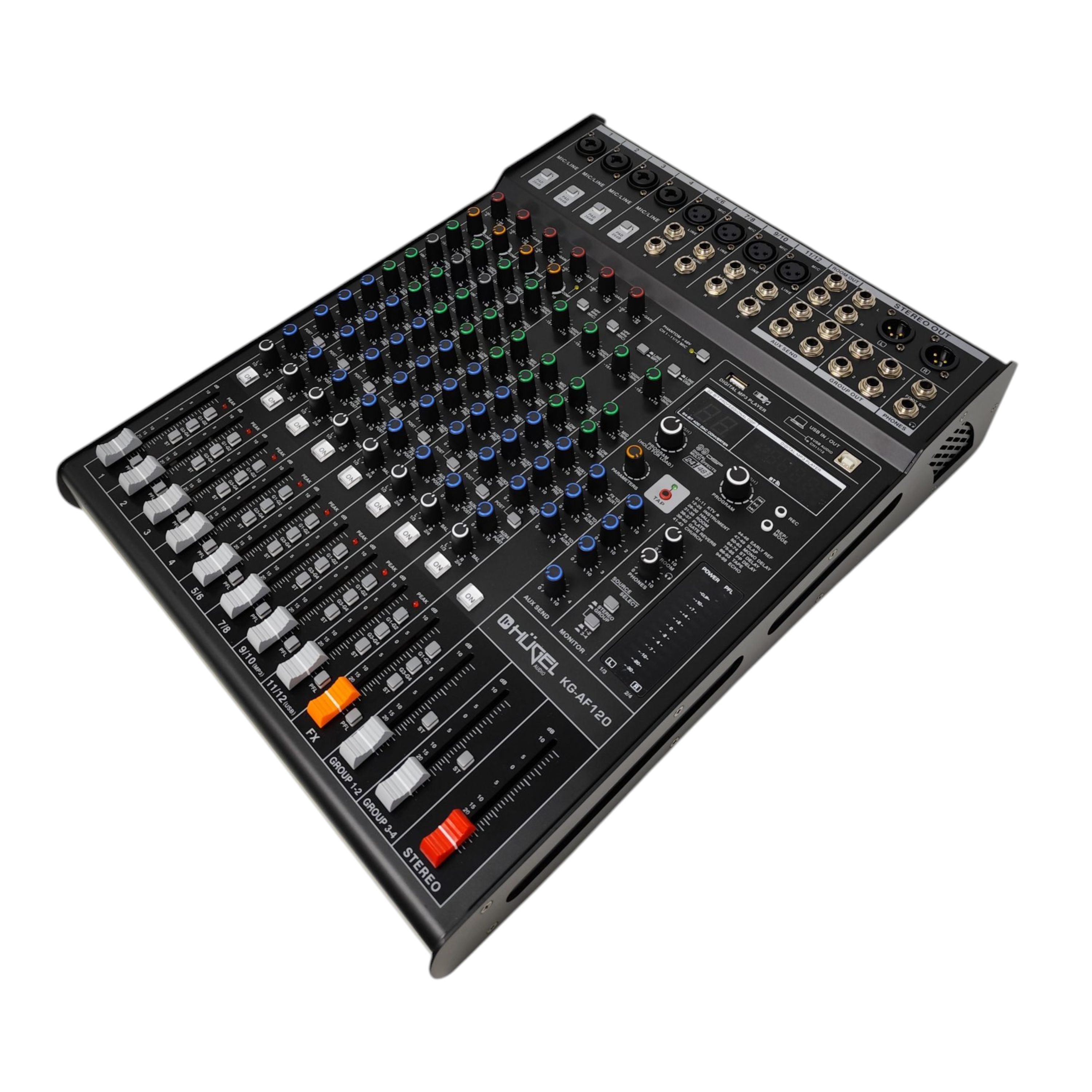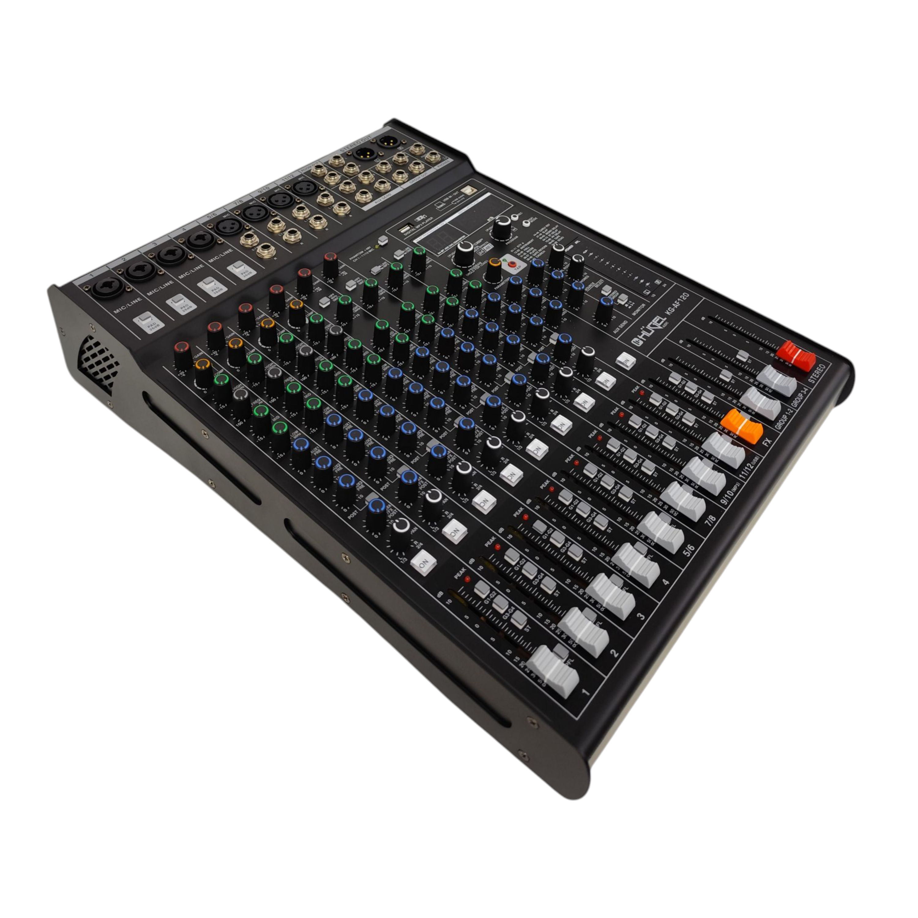 La HÜGEL KG-AF120 es una consola de mezcla profesional de 12 canales, diseñada para brindar potencia, claridad y control en estudios, eventos en vivo, ensayos o producciones audiovisuales. Su estructura robusta y su completo panel de funciones la convierten en una herramienta versátil para músicos, DJs, técnicos de sonido y creadores que buscan calidad de audio y practicidad en un mismo equipo.