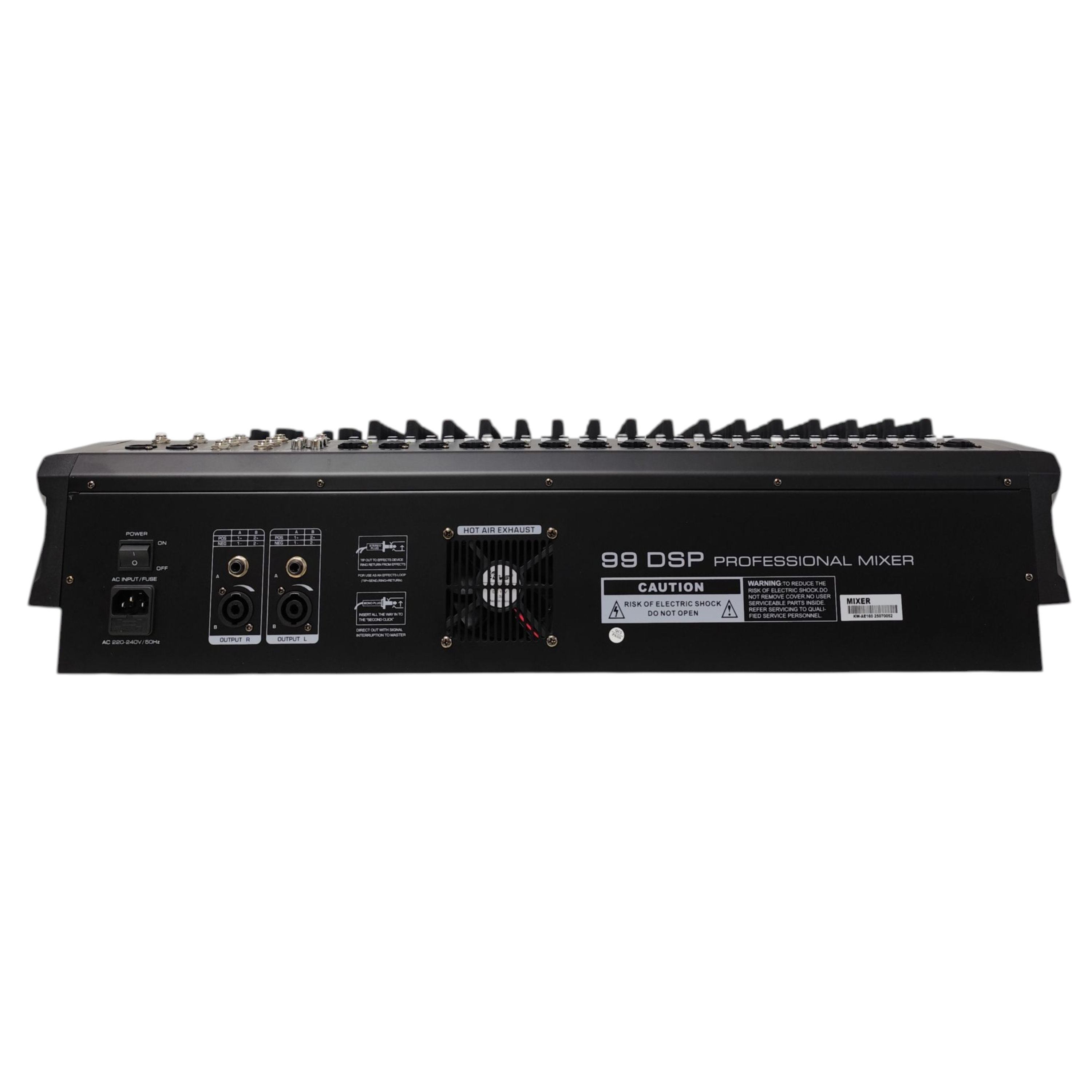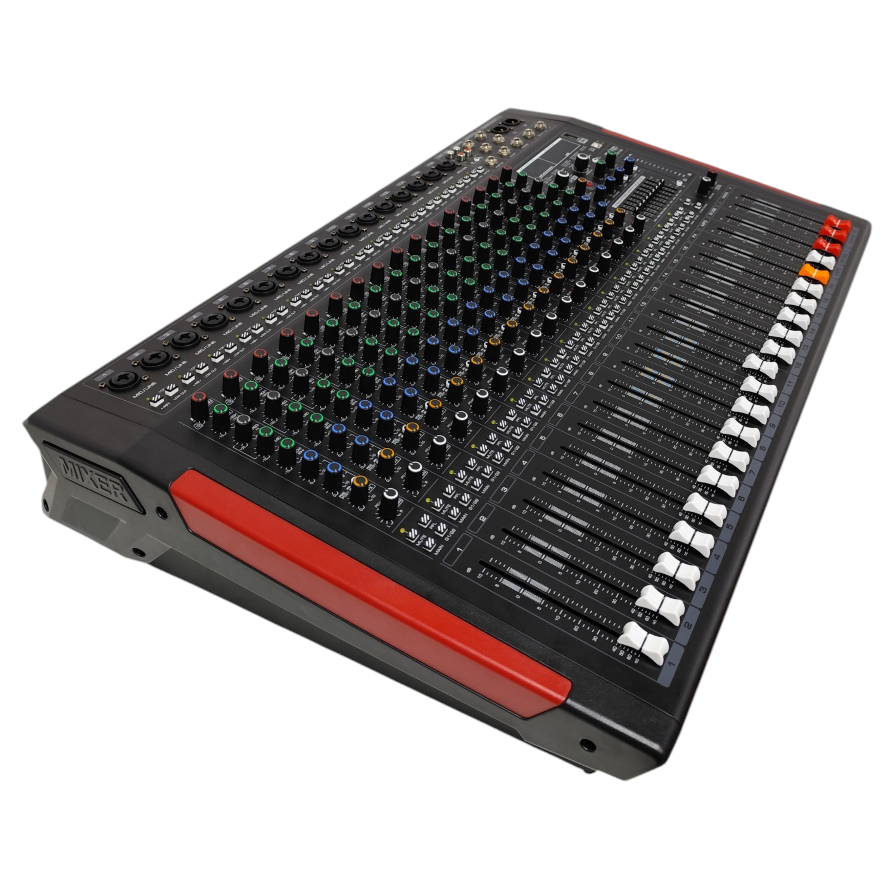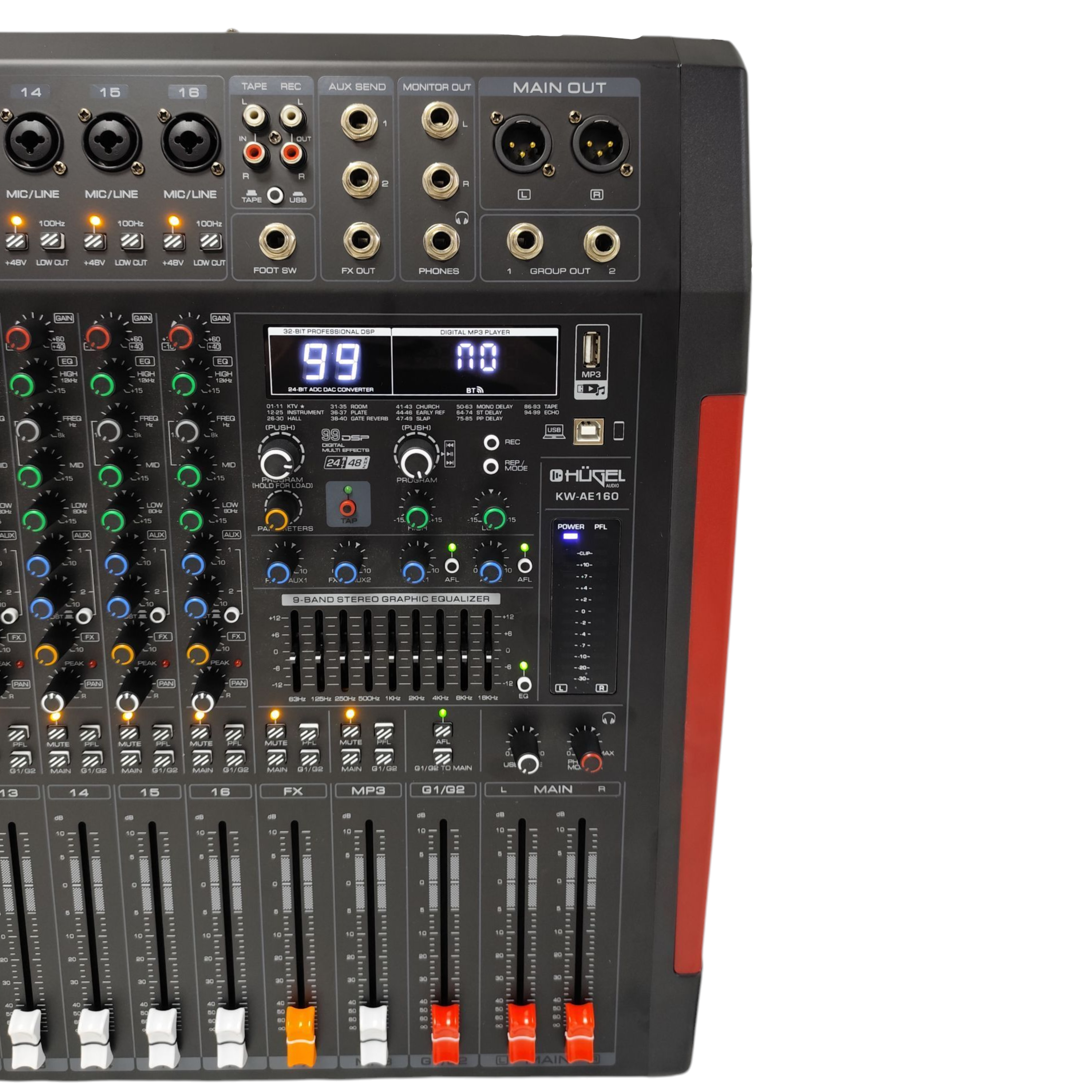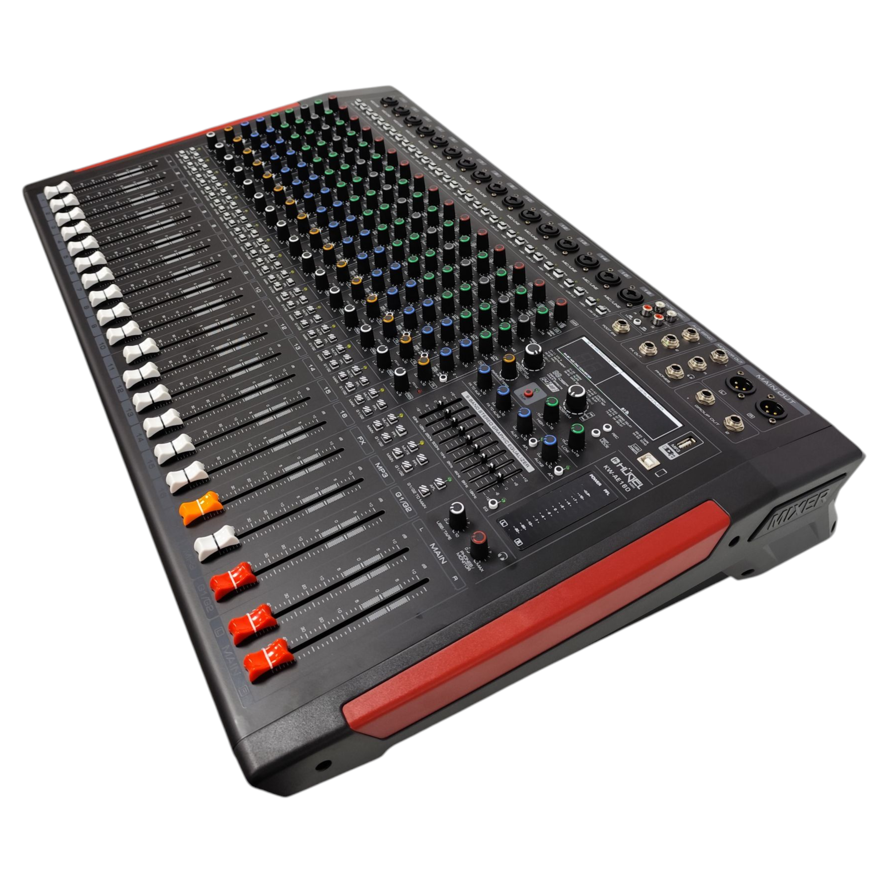 Esta consola potenciada de 16 canales ofrece una solución completa para sonido en vivo, grabación y reproducción. Ideal para músicos, bandas, iglesias, DJ, eventos y estudios. Combina un mezclador profesional con un amplificador integrado de 550W RMS reales, ofreciendo gran potencia, claridad y versatilidad en un solo equipo.