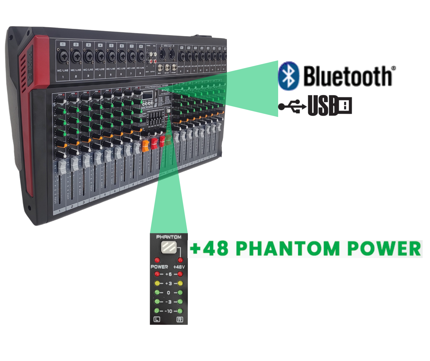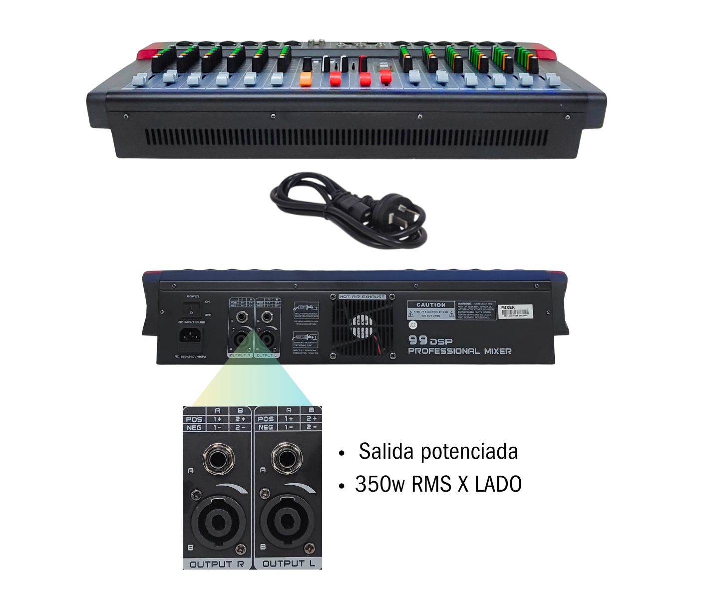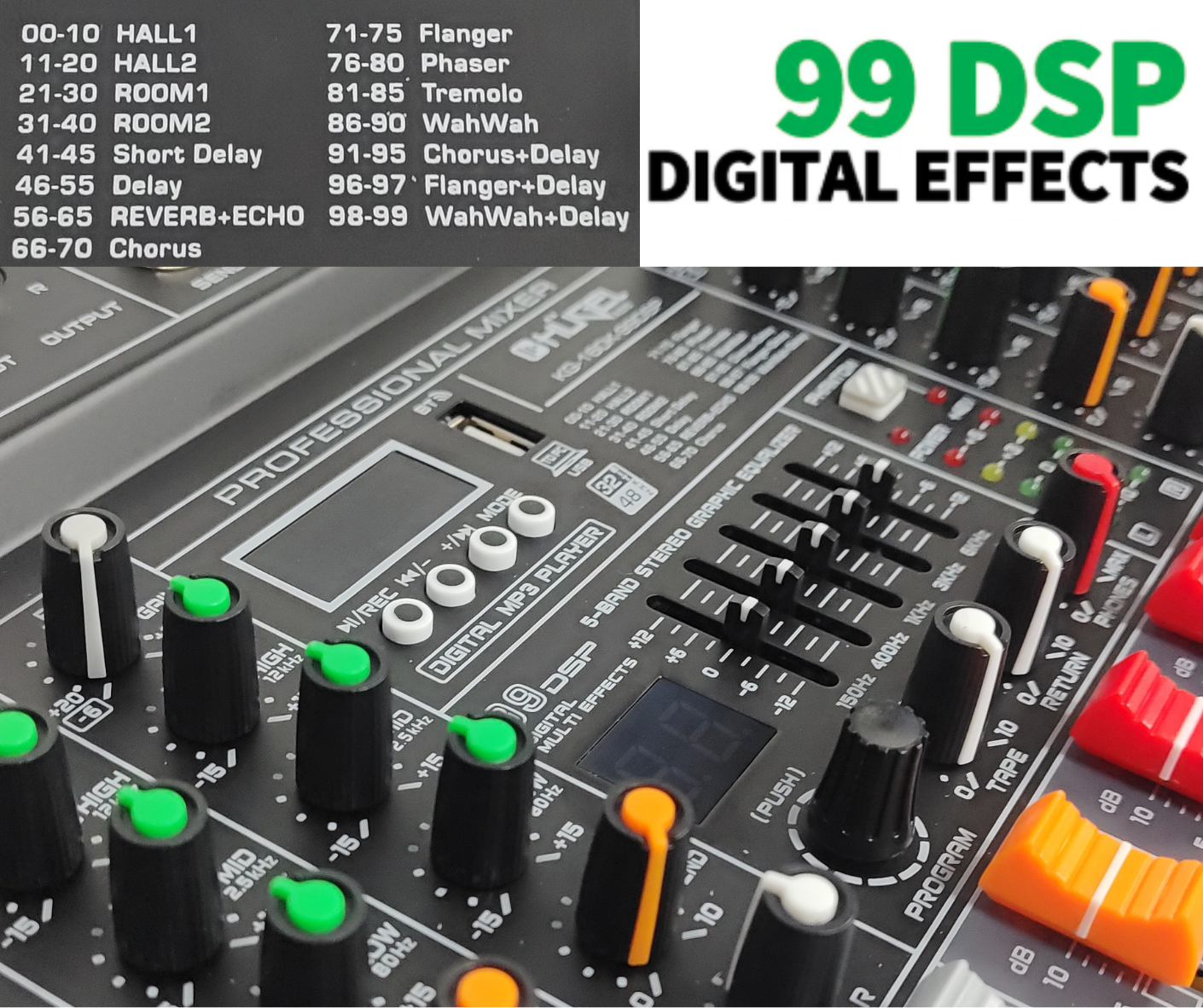 Bluetooth integrado, conexión con teléfono móvil u otro reproductor Bluetooth Reproductor MP3 integrado para reproducir música en múltiples formatos y grabar Conexión USB a PC para reproducir/grabar Este mezclador cuenta con un DSP de motor dual de 32 bits y un convertidor ADC/DAC de 24 bits, con 99 efectos digitales como ROOM, HALL, REVERB, entre otros. Ecualizador de 5 bandas ajustable para el sonido de la señal enviada a los conectores MAIN OUT. Ecualizador ultraeufónico de 3 bandas (altas, medias y bajas) en todos los canales. Envío y retorno de entrada/salida auxiliar, con conexión para ecualizador externo o procesador de efectos. Chasis de metal resistente y diseño exquisito en ambos lados.