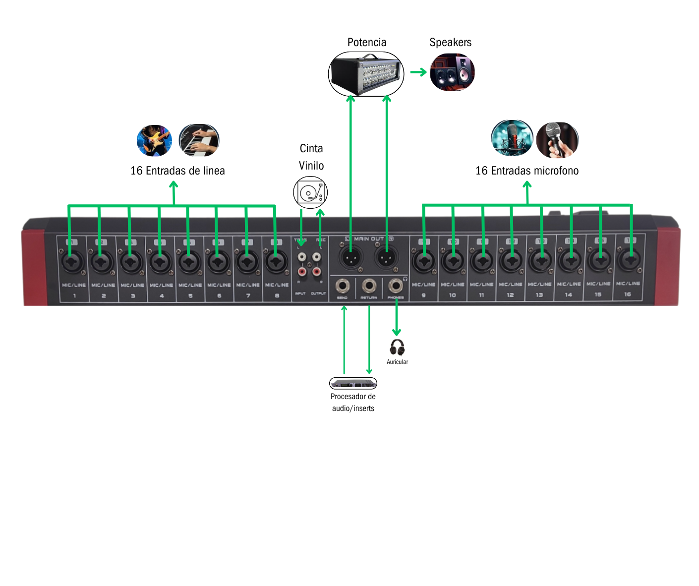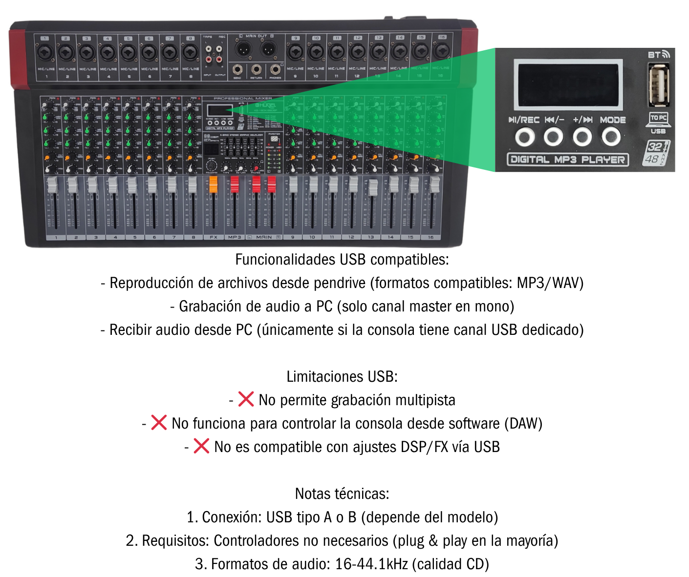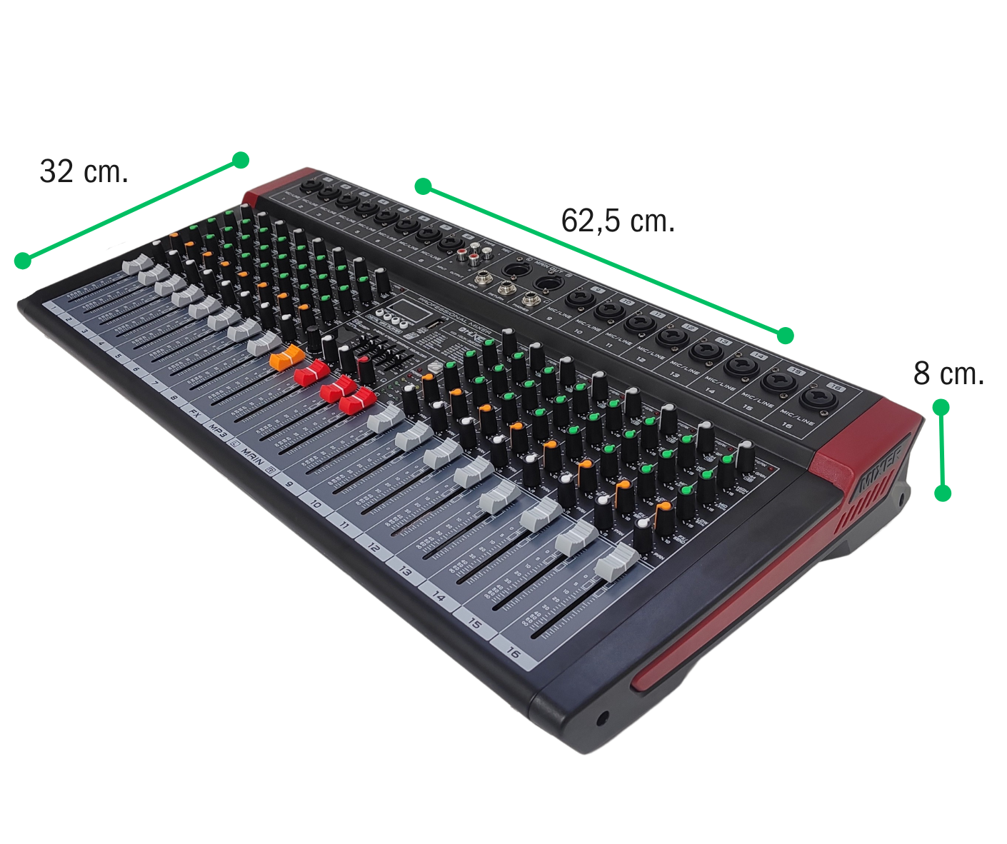 Bluetooth integrado, conexión con teléfono móvil u otro reproductor Bluetooth Reproductor MP3 integrado para reproducir música en múltiples formatos y grabar Conexión USB a PC para reproducir/grabar Este mezclador cuenta con un DSP de motor dual de 32 bits y un convertidor ADC/DAC de 24 bits, con 99 efectos digitales como ROOM, HALL, REVERB, entre otros. Ecualizador de 5 bandas ajustable para el sonido de la señal enviada a los conectores MAIN OUT. Ecualizador ultraeufónico de 3 bandas (altas, medias y bajas) en todos los canales. Envío y retorno de entrada/salida auxiliar, con conexión para ecualizador externo o procesador de efectos. Chasis de metal resistente y diseño exquisito en ambos lados.