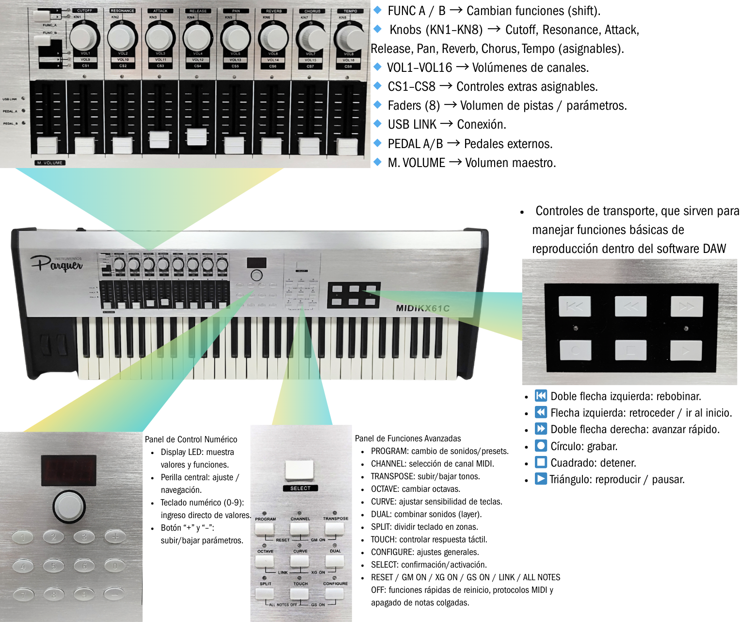 Pantalla Led, 1 Botones de Control Para El Cambio de Programa, Transpose, Octave, Canal, Split, Dual y Muchos Otros.