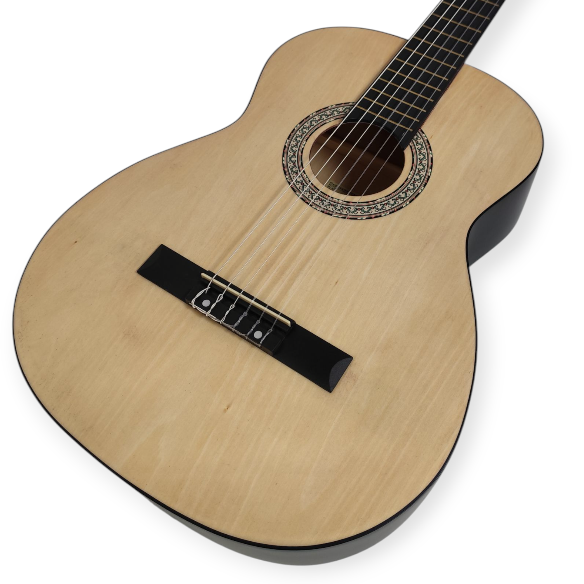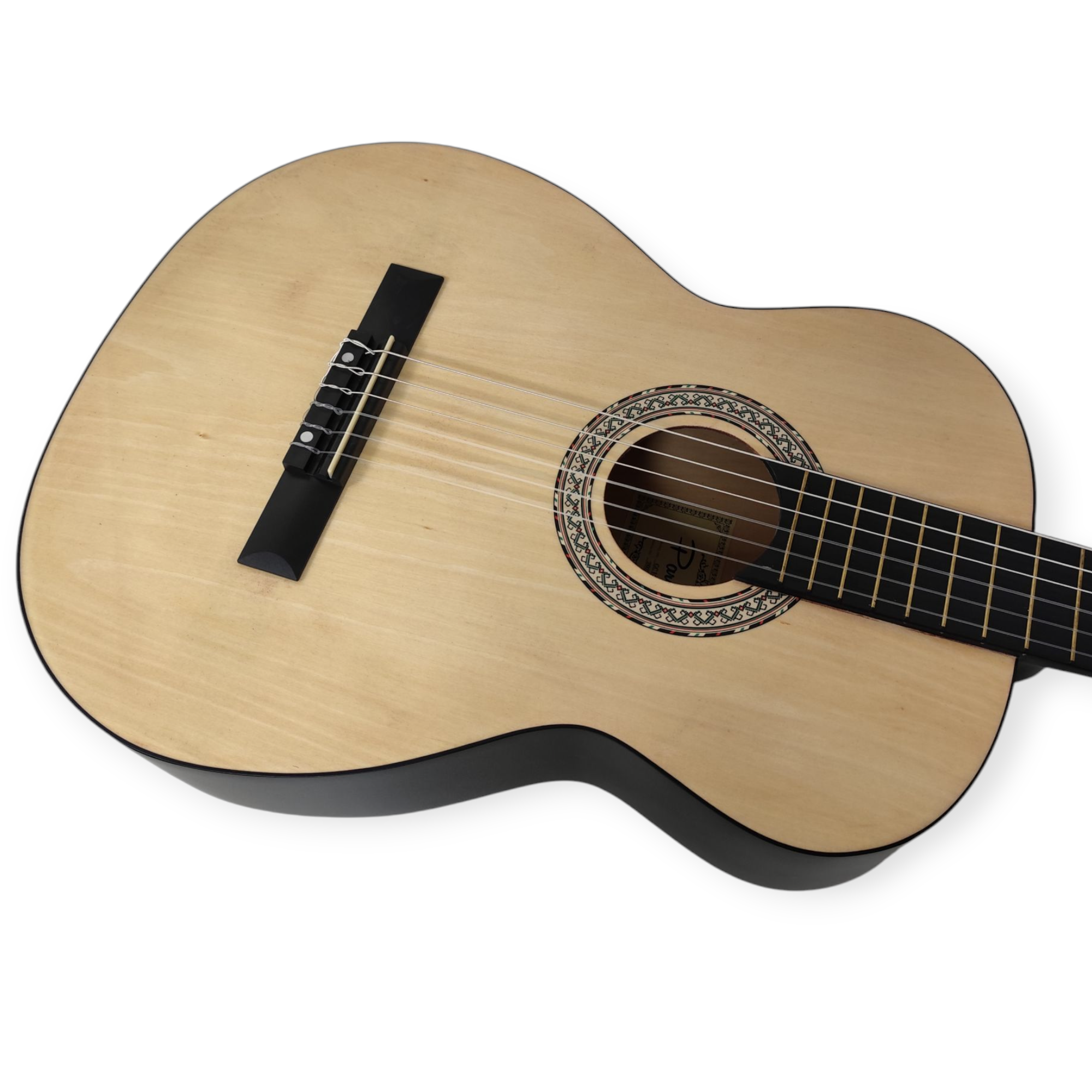 Guitarra Clasica Custom 39″. Color: Marrón Claro. Terminación: Mate. Tapa: Abeto Laminado. Fondo y Aros: Tilo Laminado. Incluye Funda.