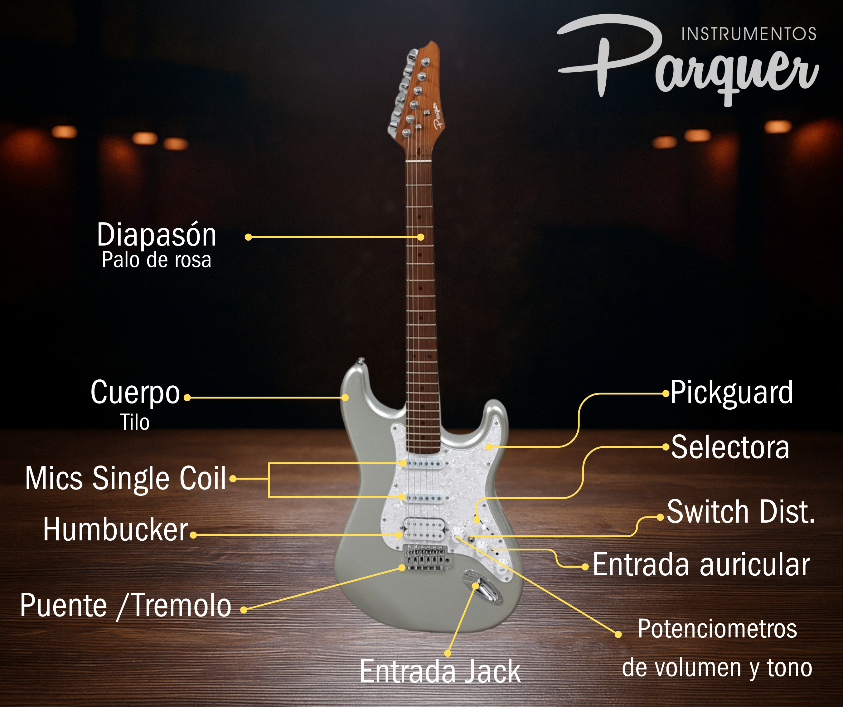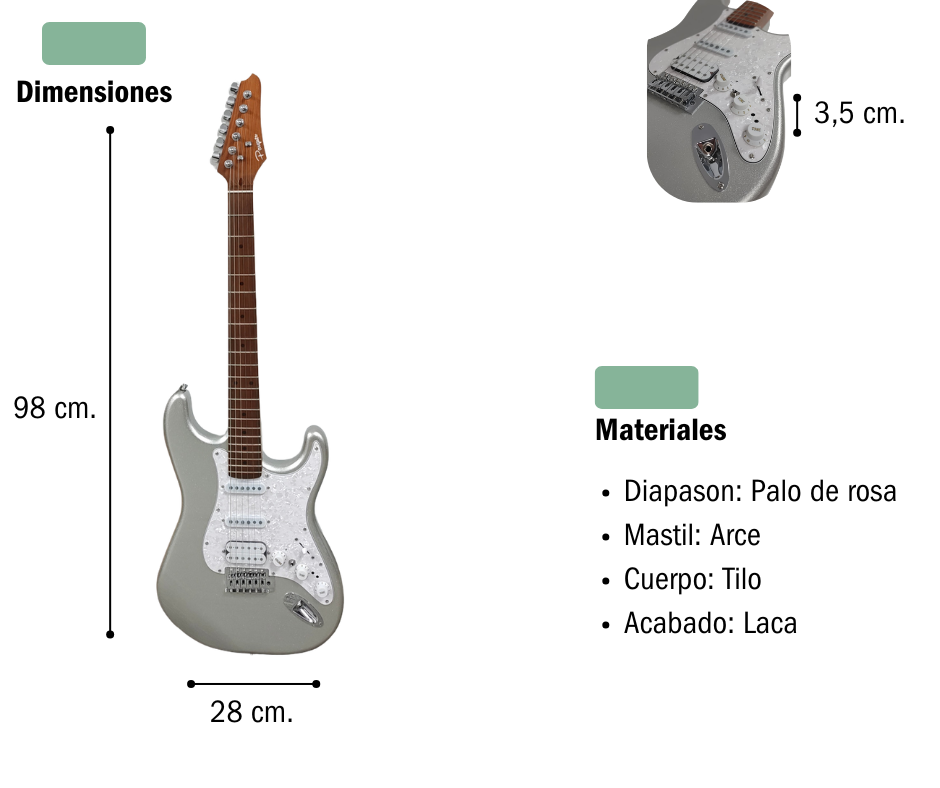 Descubrí una guitarra diferente. Este modelo Parquer incorpora sistema activo con efectos integrados, ideal para quienes buscan versatilidad sin necesidad de pedales externos.