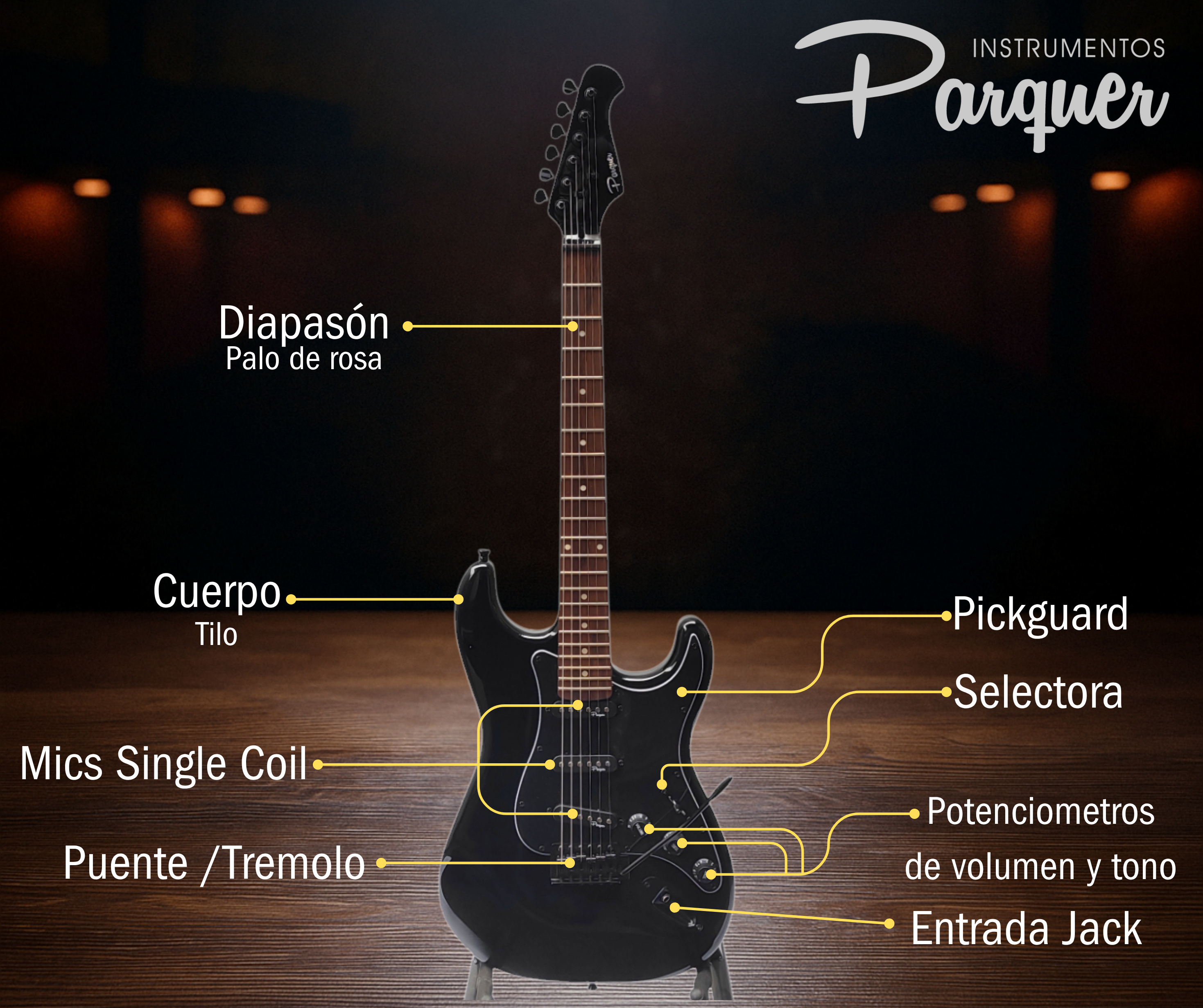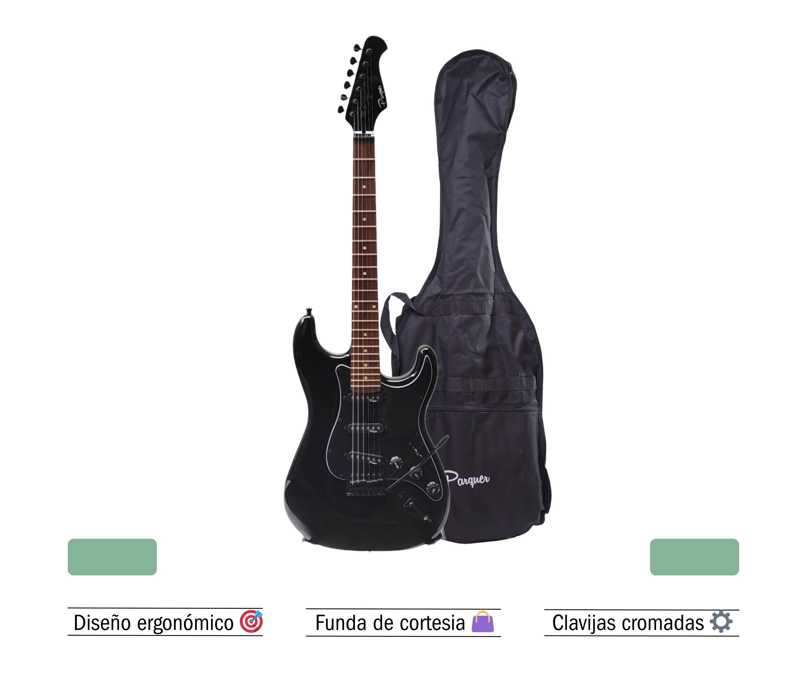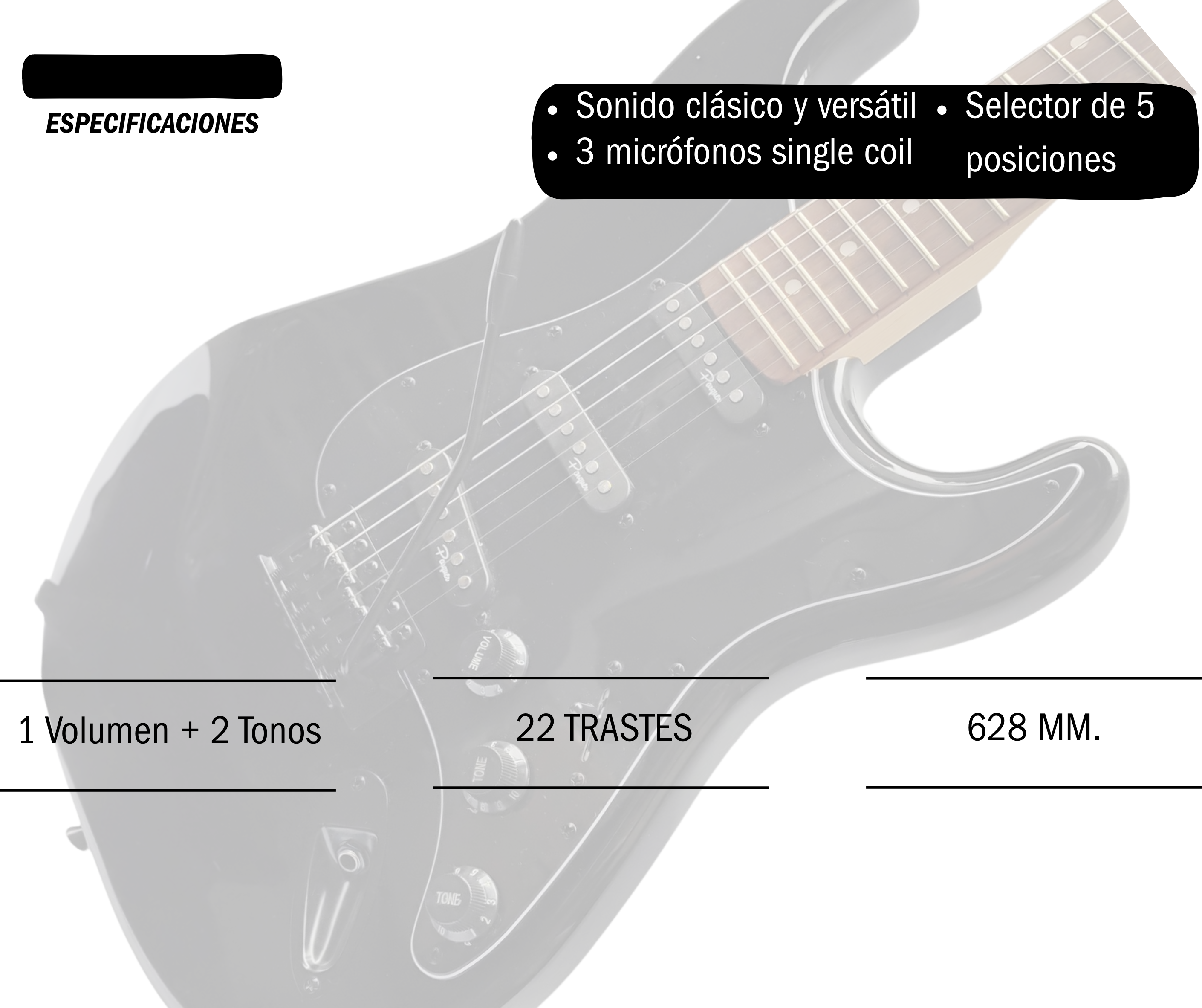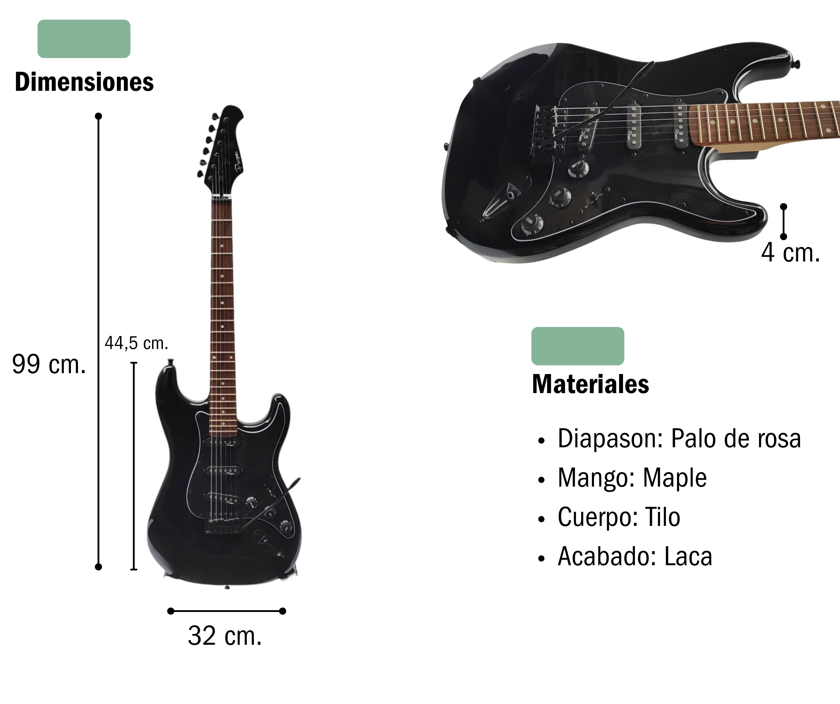 GUITARRA TIPO STRATO. MODELO EAGLE. COLOR NEGRA. PICKGUARD Y HERRAJES NEGROS.