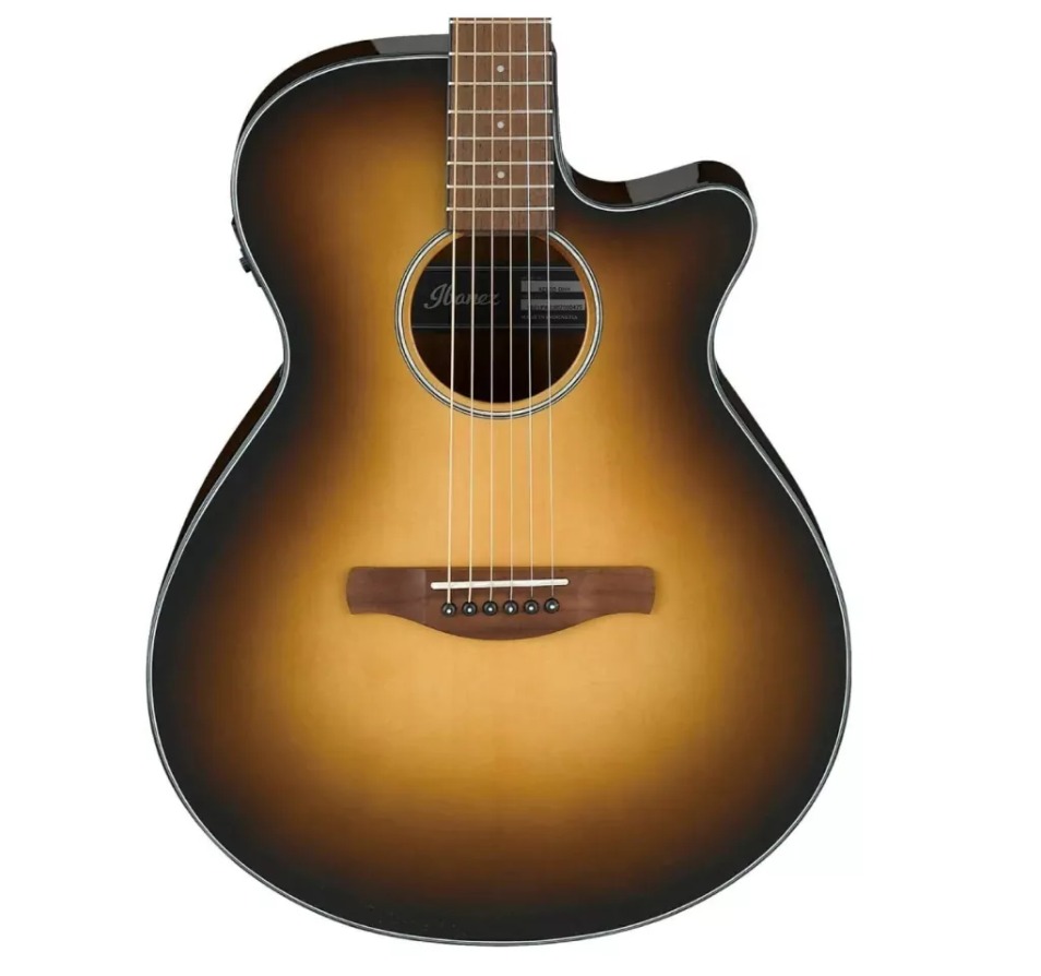 Guitarra electroacustica con tapa de abeto, fondo y aros de sapeli, mastil de Nyatoh, diapason de nogal y electronica Ibanez, color Dark Honey Burst High Gloss