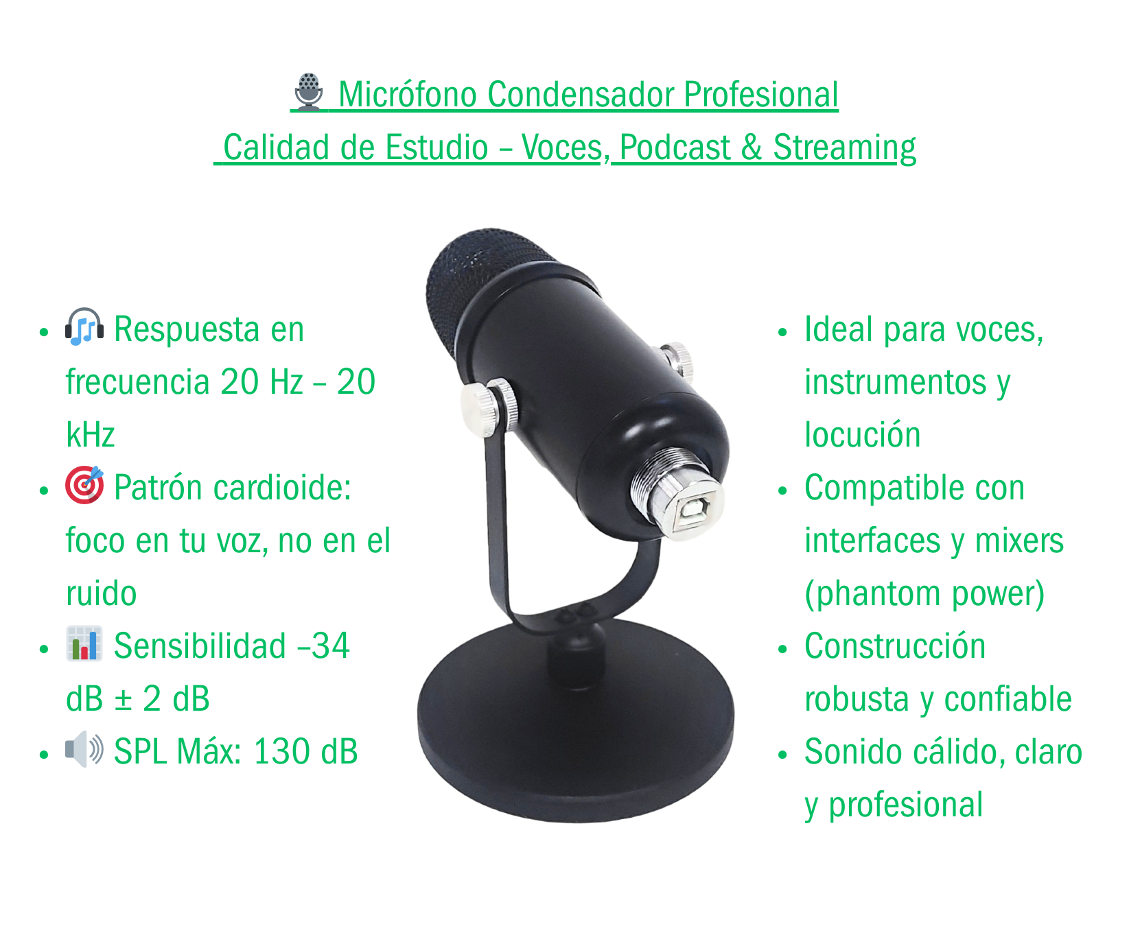 Este micrófono condensador profesional es ideal para quien busca calidad de estudio en voz, locución, instrumentos acústicos, streaming y producción. Combina componentes de alto nivel con un diseño robusto para ofrecer rendimiento confiable en múltiples usos.
