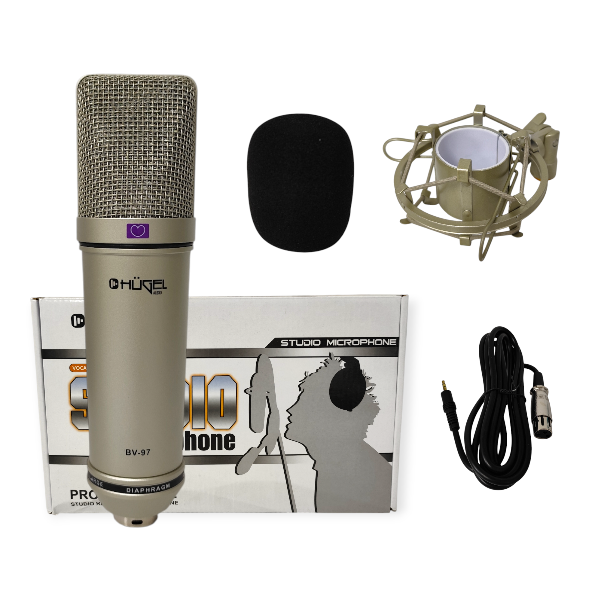 El micrófono de condensador BV-97 ofrece calidad profesional para grabaciones de voz, instrumentos, streaming, podcasts y estudio. Su patrón polar cardioide captura el sonido con gran claridad, reduciendo ruidos de ambiente.