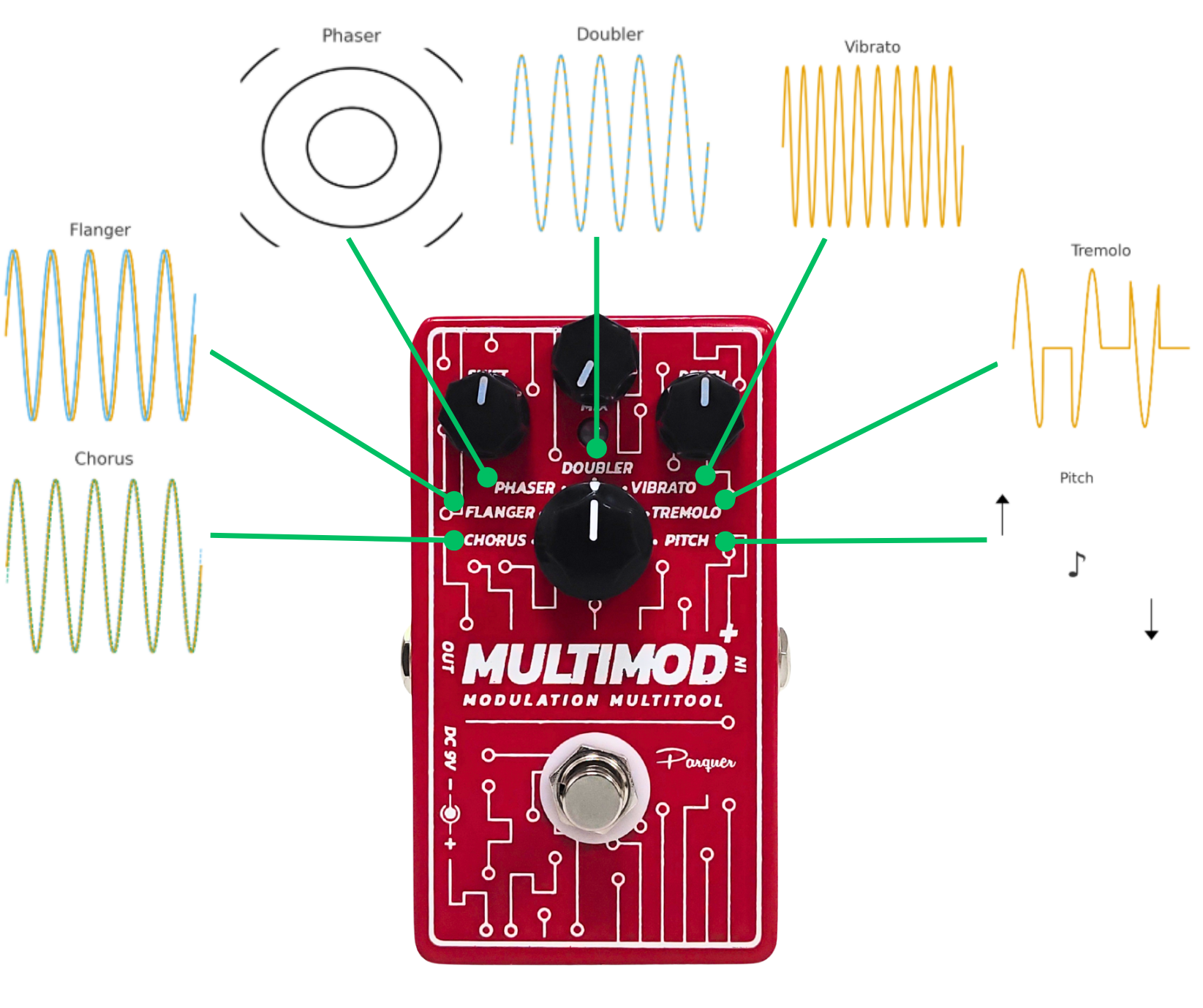 La Parquer Multimod reúne 7 efectos de modulación imprescindibles en un solo pedal compacto y resistente. Inspirada en el concepto de una multiherramienta, te ofrece una amplia paleta de sonidos profesionales en un formato práctico y accesible. Ideal tanto para ensayo como para grabación o vivo.