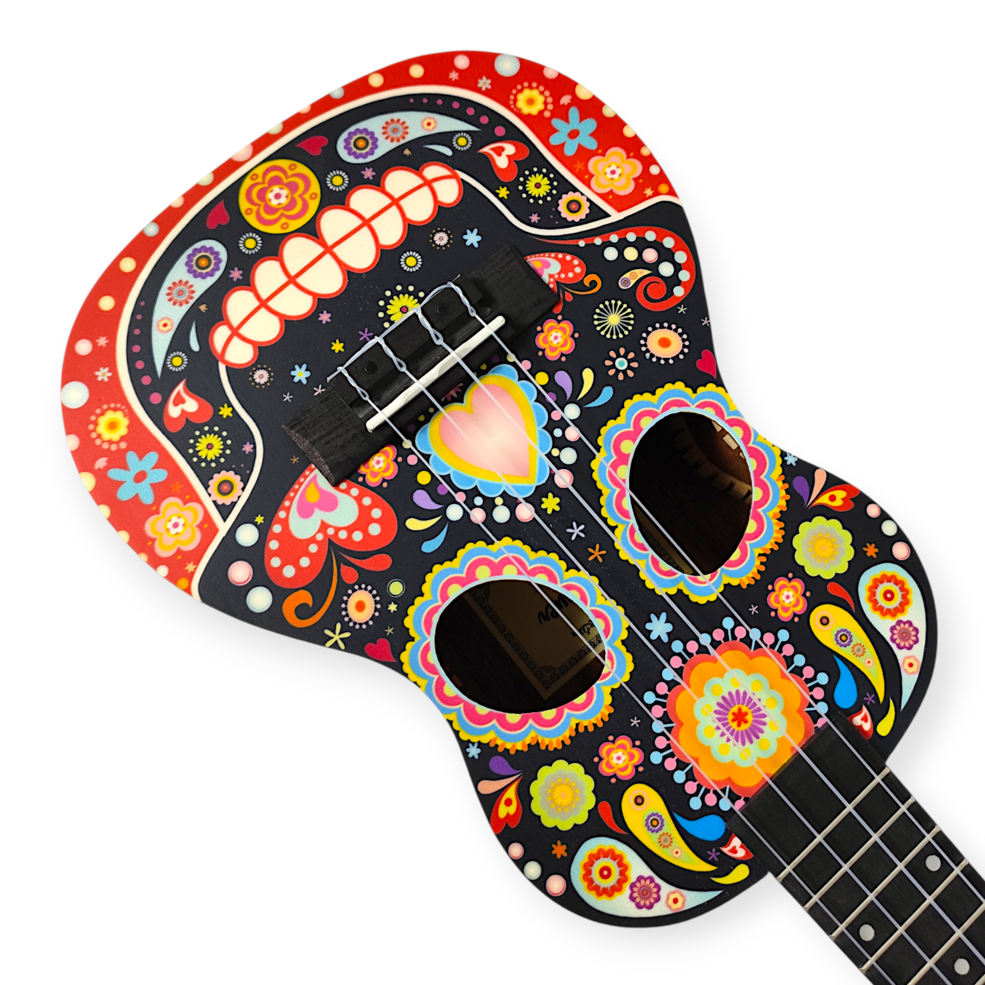 Ukelele 23″ Sublimado Modelo Coco. Tapa Abeto. Cuerpo y Fondo Caoba. Incluye Funda.